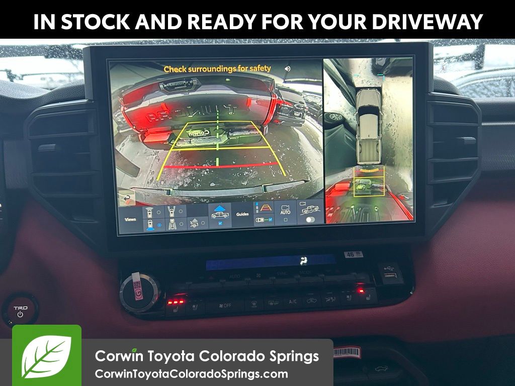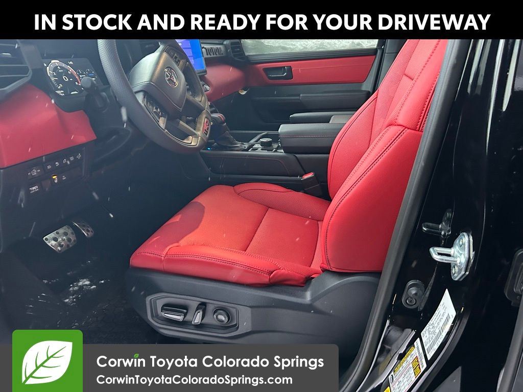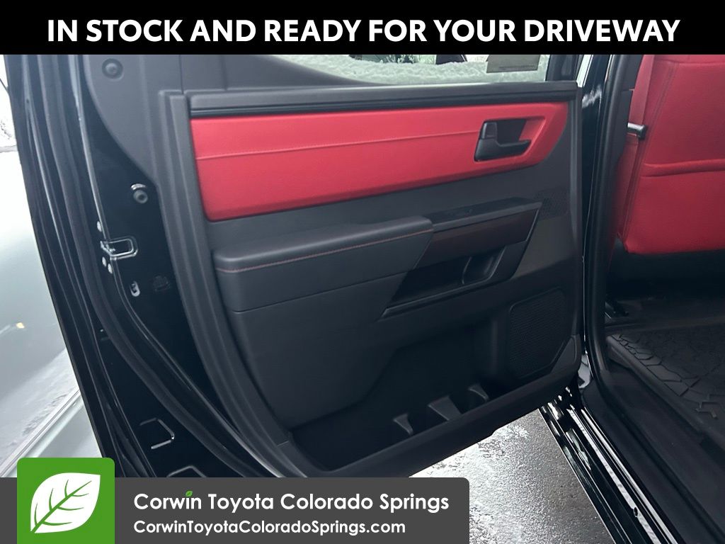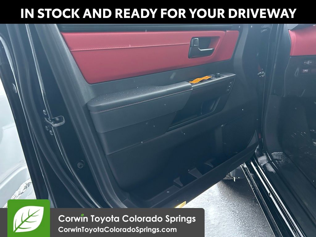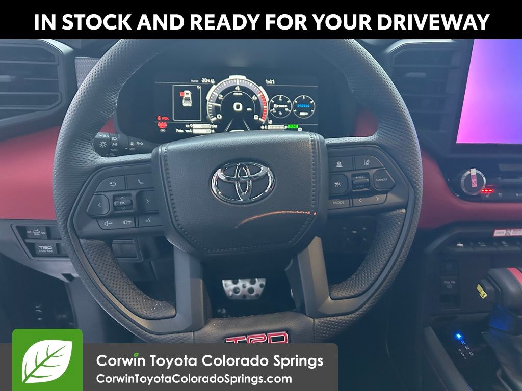 • TRD leather-wrapped manual tilt/telescopic steering wheel with TRD badge, red center stripe, and phone, audio, display/infotainment, and Driver Assist controls