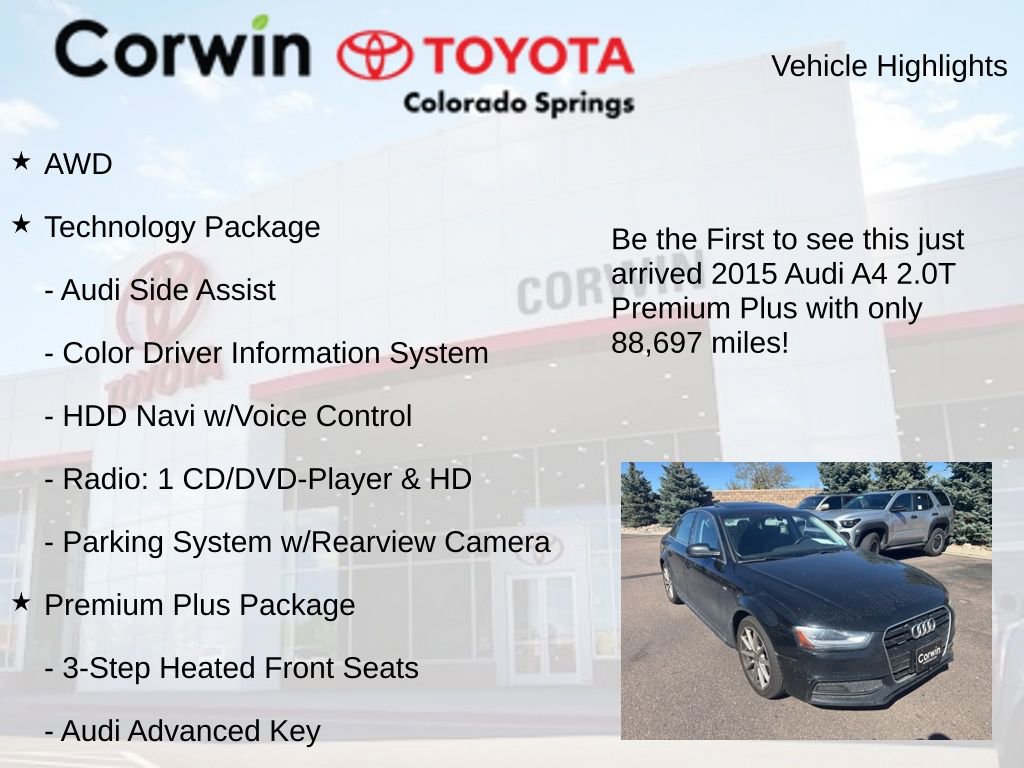 Discover the exceptional 2015 Audi A4 2.0T Premium Plus quattro, a sophisticated and dynamic sedan that combines performance, technology, and refined style. This well-equipped Audi offers a compelling blend of features that cater to the discerning driver.