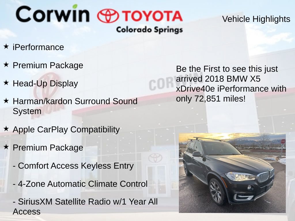 This BMW X5 is well equipped and includes the following features and benefits, iPerformance, Premium Package, Head-Up Display, Harman/kardon Surround Sound System, Apple CarPlay Compatibility, 4-Zone Automatic Climate Control, Comfort Access Keyless Entry, Premium Package, SiriusXM Satellite Radio w/1 Year All Access. Odometer is 16981 miles below market average!
