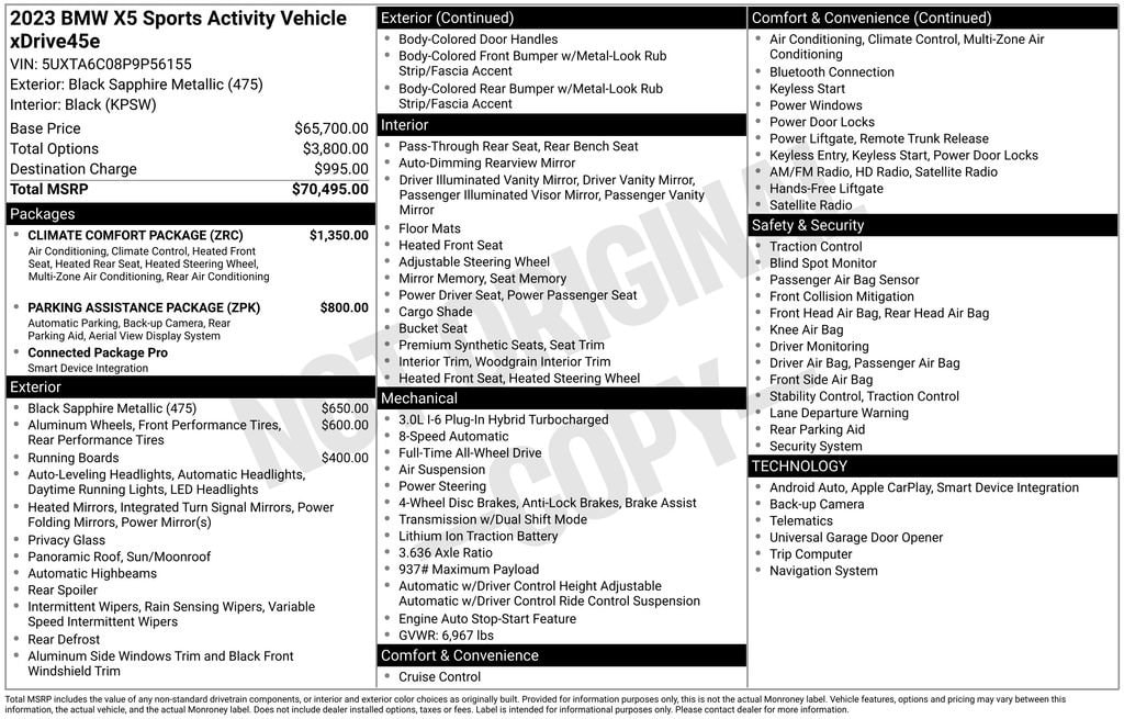 Experience the pinnacle of luxury and performance with this 2023 BMW X5 xDrive45e. This exceptional SUV is equipped with a powerful 3.0L I6 DOHC 24V TwinPower Turbo engine, delivering an exhilarating driving experience. Boasting a sleek Black exterior, this BMW X5 is a true head-turner, commanding attention wherever it goes.