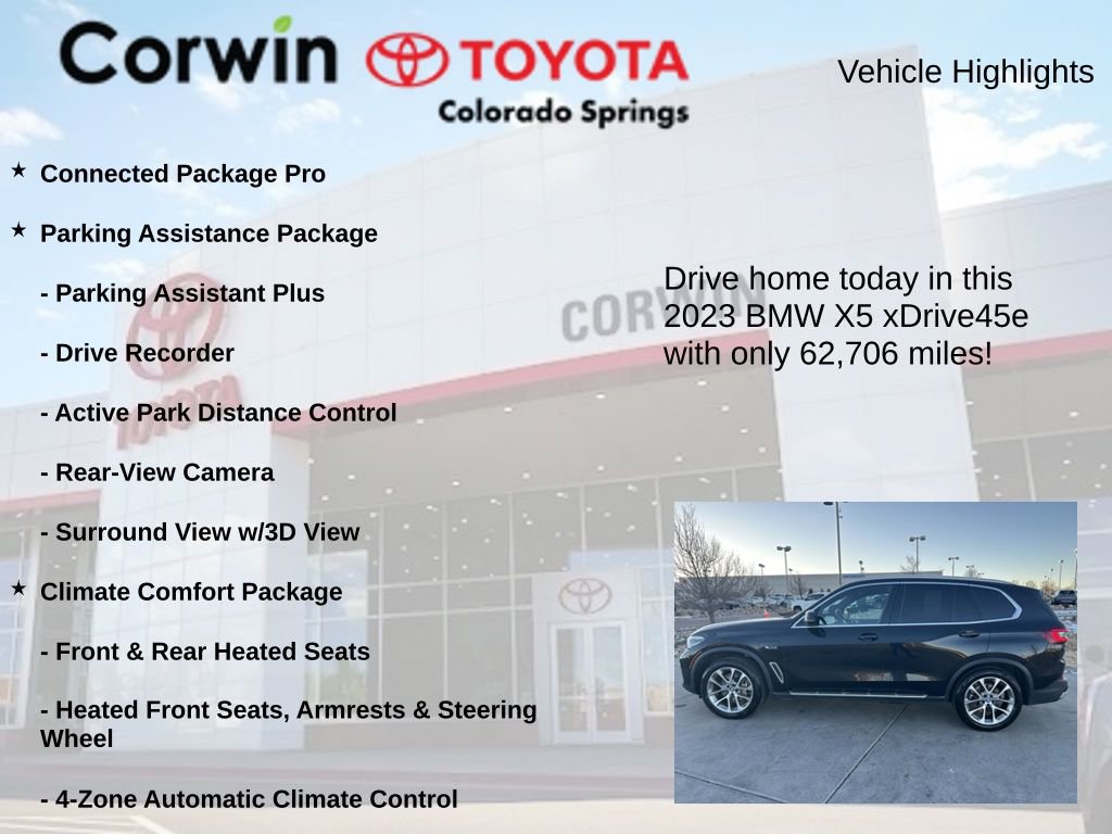 Whether you're commuting to the office, embarking on a road trip, or navigating the city streets, this 2023 BMW X5 xDrive45e is the perfect blend of style, performance, and technology. Experience the ultimate in luxury and capability today. We invite you to schedule a test drive and discover the exceptional qualities of this remarkable SUV.