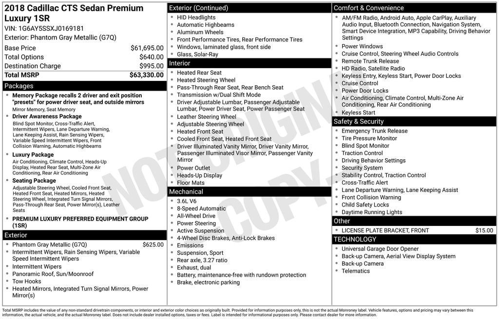 This Cadillac CTS is well equipped and includes the following features and benefits, 110V Power Receptacle, Automatic Parking Assist, Bose Centerpoint Surround Sound 13-Speaker System, Color Head-Up Display, Driver Awareness Package, Following Distance Indicator, Forward Collision Alert, Heated Rear Outboard Seating Positions, Illuminated Door Handles, Illuminated Front Door Sill Plates, IntelliBeam Automatic High Beam On/Off, Lane Change Alert w/Side Blind Zone Alert, Lane Keep Assist w/Lane Departure Warning, Luxury Package, Manual Rear Side Window Sunshades, Power Rear Window Sunshade, Preferred Equipment Group 1SR, Radio: Cadillac User Experience w/Embedded Nav, Rainsense Wipers, Rear Cross Traffic Alert, Seating Package, SiriusXM Satellite & HD Radio, Tri-Zone Climate Control, UltraView Power Sunroof. 19/27 City/Highway MPG