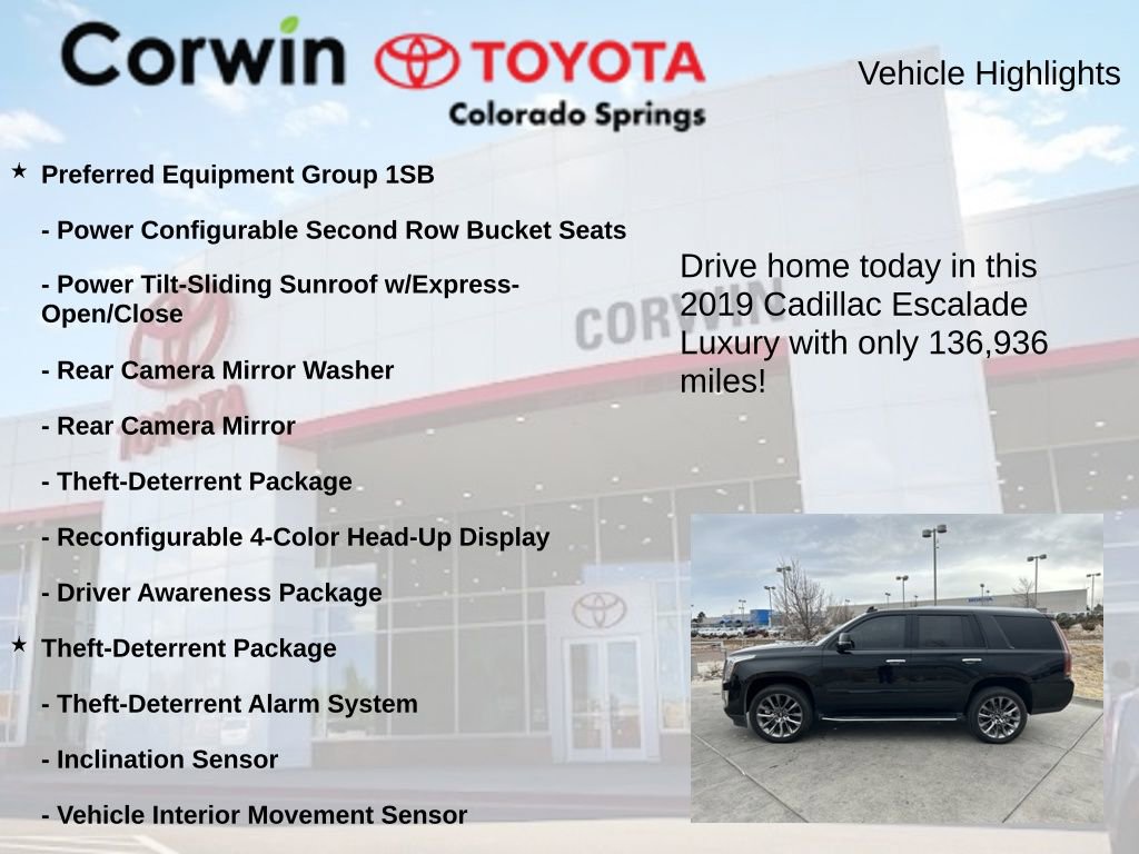 This Cadillac Escalade is well equipped and includes the following features and benefits, Driver Awareness Package, Escalade Sport Edition, Forward Collision Alert, Gloss Black Front Grille, IntelliBeam Automatic High Beam On/Off, Lane Change Alert w/Side Blind Zone Alert, Lane Keep Assist w/Lane Departure Warning, Low Speed Forward Automatic Braking, Power Configurable Second Row Bucket Seats, Power Tilt-Sliding Sunroof w/Express-Open/Close, Preferred Equipment Group 1SB, Rear Camera Mirror, Rear Camera Mirror Washer, Rear Cross Traffic Alert, Reconfigurable 4-Color Head-Up Display, Safety Alert Seat, Theft-Deterrent Package, Wheels: 22" 12-Spoke Alloy.