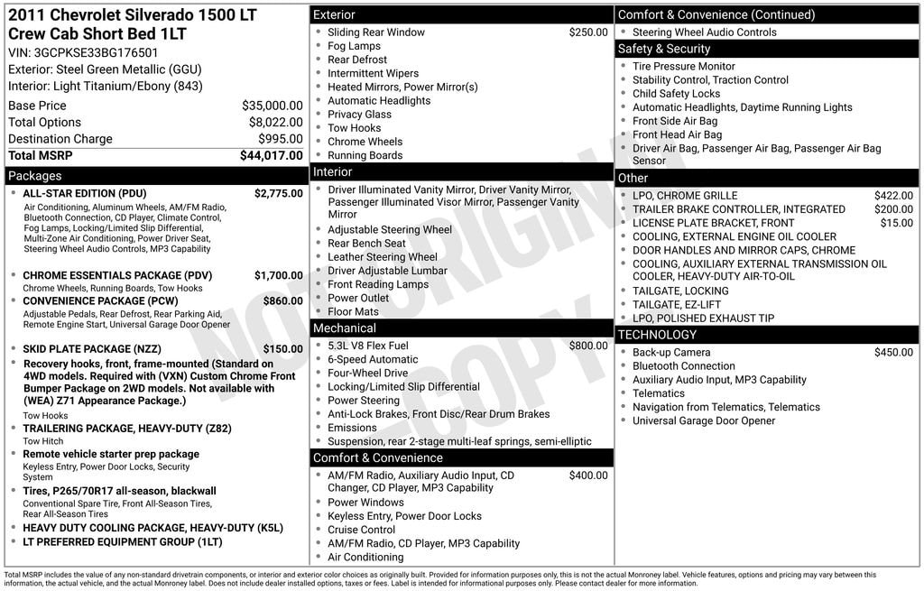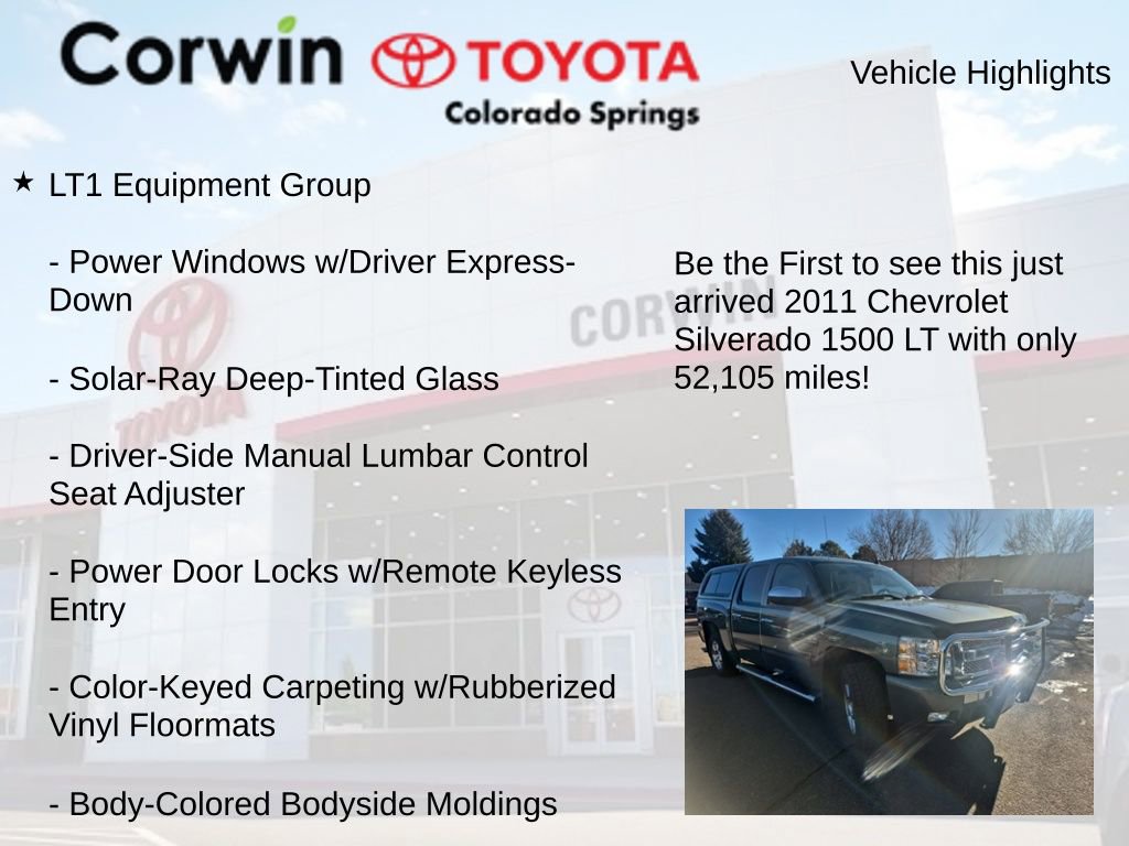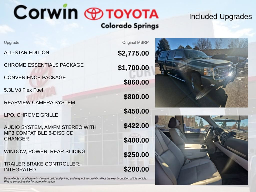 This Chevrolet Silverado 1500 is well equipped and includes the following features and benefits, 17" x 7.5" 5-Spoke Aluminum Wheels, 18" x 8" Chrome-Clad Aluminum Wheels, 6 Speaker Audio System Feature, 6" Tubular Oval Chrome Assist Steps, All-Star Edition, AM/FM Stereo w/CD Player & MP3 Playback, Bluetooth® For Phone, Body-Colored Bodyside Moldings, Chrome Door Handles & Mirror Caps, Chrome Essentials Package, Chrome Grille Surround, Chrome Recovery Hooks, Color-Keyed Carpeting w/Rubberized Vinyl Floormats, Convenience Package, Driver & Front Passenger Illuminated Visor Mirrors, Driver-Side Manual Lumbar Control Seat Adjuster, Dual-Zone Automatic Climate Control, Electric Rear-Window Defogger, Electronic Autotrac Transfer Case, Electronic Cruise Control w/Set & Resume Speed, EZ-Lift Tailgate, Front Halogen Fog Lamps, Heated Power-Adjustable Black Outside Mirrors, Heavy Duty Cooling Package, Heavy-Duty Air-to-Oil External Engine Oil Cooler, Heavy-Duty Auxiliary External Transmission Oil Cooler, Heavy-Duty Handling/Trailering Suspension Package, Heavy-Duty Rear Automatic Locking Differential, Heavy-Duty Trailering Package, Heavy-Duty Trailering Package (Retail), Leather-Wrapped Steering Wheel, Locking Tailgate, LT1 Equipment Group, Polished Exhaust Tip, Power Door Locks w/Remote Keyless Entry, Power Windows w/Driver Express-Down, Power-Adjustable Pedals For Accelerator & Brake, Remote Vehicle Starter System, Skid Plate Package, Solar-Ray Deep-Tinted Glass, Spare Tire Lock, Steering Wheel Mounted Audio Controls, Ultrasonic Rear Parking Assist w/Audible Warning, Universal Home Remote.