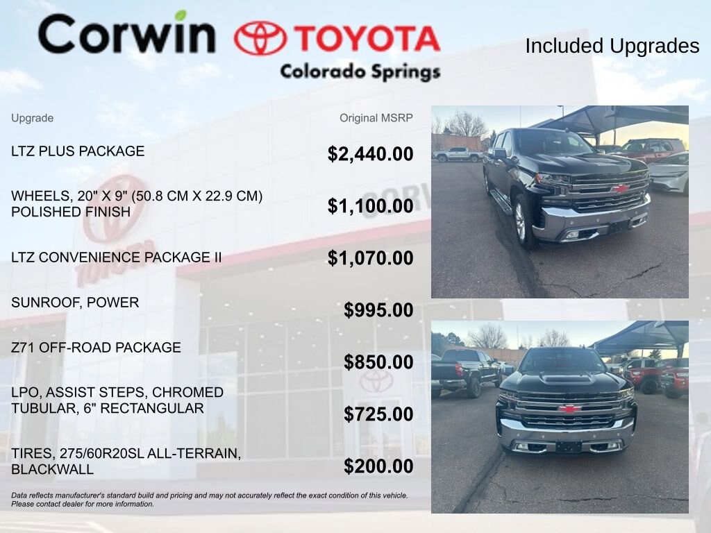 This Chevrolet Silverado 1500 is well equipped and includes the following features and benefits, 4WD LTZ, 2 USB Ports (First Row), 2nd Row Heated Outboard Seats, Floor Mounted Console, Front Bucket Seats, LTZ Convenience Package, LTZ Convenience Package II, LTZ Plus Package, Power Sliding Rear Window w/Rear Defogger, Power Tailgate, Premium Bose 7-Speaker Sound System, Radio: Chevrolet Infotainment 3 Premium System, Safety Package, Universal Home Remote, Ventilated Driver & Front Passenger Seats, Wireless Charging.