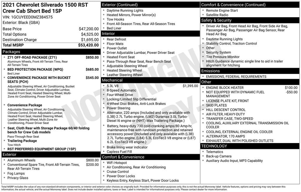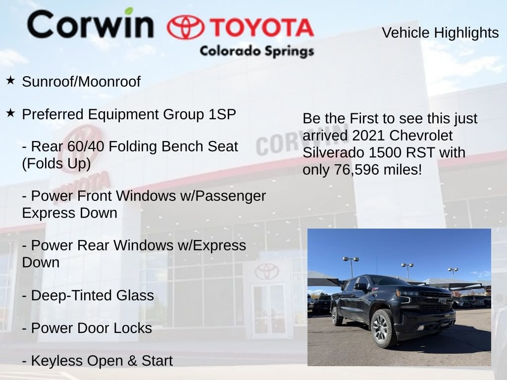 This Chevrolet Silverado 1500 is well equipped and includes the following features and benefits, Sunroof/Moonroof, 10-Way Power Driver Seat w/Lumbar, 12-Volt Rear Auxiliary Power Outlet, 2 USB Ports (First Row), 4.2" Diagonal Color Display Driver Info Center, 6-Speaker Audio System, All-Star Edition, Auto-Locking Rear Differential, Bluetooth® For Phone, Body Color Grille, Color-Keyed Carpeting Floor Covering, Compass, Convenience Package, Convenience Package w/Buckets Seats, Deep-Tinted Glass, Dual Exhaust w/Polished Outlets, Dual-Zone Automatic Climate Control, Electric Rear-Window Defogger, Electrical Lock Control Steering Column, Electronic Cruise Control, EZ Lift Power Lock & Release Tailgate, Floor Mounted Center Console, Front Bucket Seats, Front Frame-Mounted Black Recovery Hooks, Front LED Fog Lamps, Front Rubberized Vinyl Floor Mats, Heated Driver & Front Outboard Passenger Seats, Heated Steering Wheel, Heavy-Duty Air Filter, High Gloss Black Mirror Caps, Hill Descent Control, Keyless Open & Start, Leather Wrapped Steering Wheel, LED Cargo Area Lighting, Manual Tilt/Telescoping Steering Column, Off-Road Suspension, OnStar & Chevrolet Connected Services Capable, Power Door Locks, Power Front Windows w/Driver Express Up/Down, Power Front Windows w/Passenger Express Down, Power Rear Windows w/Express Down, Preferred Equipment Group 1SP, Rear 60/40 Folding Bench Seat (Folds Up), Rear Dual USB Charging-Only Ports, Rear Rubberized-Vinyl Floor Mats, Rear Vision Camera, Remote Vehicle Starter System, SiriusXM Radio, Standard Tailgate, Steering Wheel Audio Controls, Theft Deterrent System (Unauthorized Entry), Trailering Package, Z71 Off-Road Package.