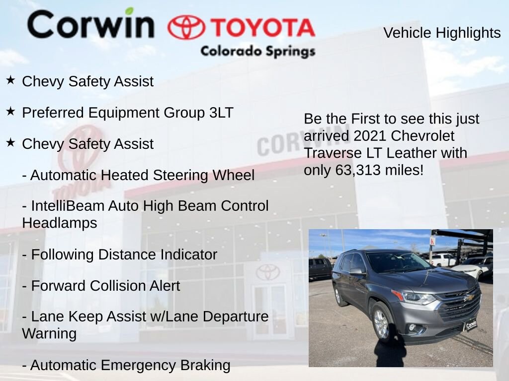 This Chevrolet Traverse is well equipped and includes the following features and benefits, Chevy Safety Assist, Automatic Emergency Braking, Automatic Heated Steering Wheel, Chevy Safety Assist, Following Distance Indicator, Forward Collision Alert, Front License Plate Bracket Mounting Package, Front Pedestrian Braking, IntelliBeam Auto High Beam Control Headlamps, Lane Keep Assist w/Lane Departure Warning, Preferred Equipment Group 3LT. Odometer is 27001 miles below market average! 18/27 City/Highway MPG