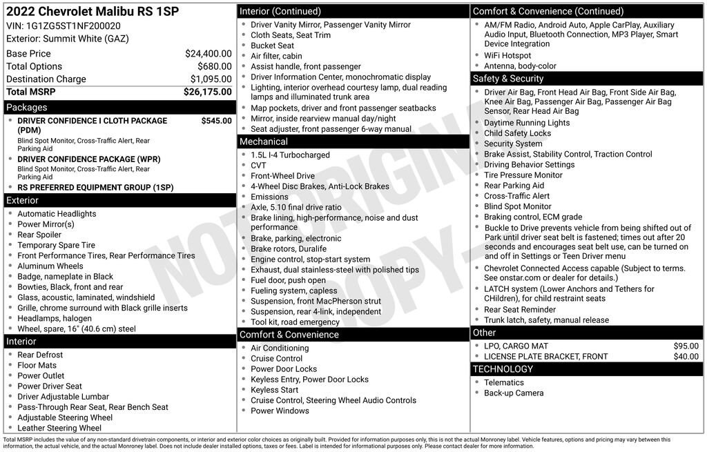 Whether you're commuting to work, running errands, or embarking on a road trip, this 2022 Chevrolet Malibu RS is the perfect companion. Its combination of performance, efficiency, technology, and safety features make it an exceptional value in the midsize sedan segment.