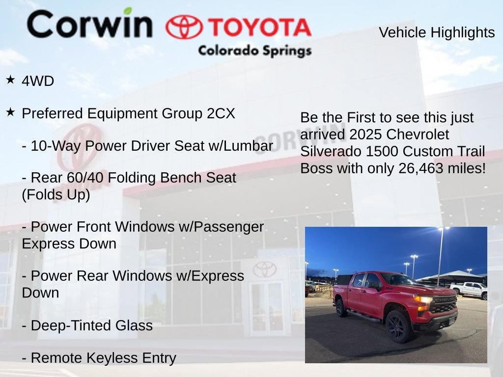 Whether you're tackling rugged terrain or navigating the daily commute, the 2025 Chevrolet Silverado 1500 Custom Trail Boss is the perfect companion. Experience the perfect blend of capability, style, and technology that will elevate your driving experience. Visit our showroom today and discover the power and versatility of this exceptional pickup.