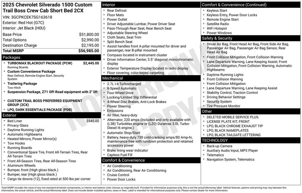 The heart of this Silverado is the powerful 2.7L I4 Turbocharged engine, delivering an impressive 310 horsepower and 17 MPG on the highway. With 4WD and the Custom Trail Boss package, you'll conquer any terrain with confidence, whether it's traversing muddy backroads or navigating through snowy conditions.