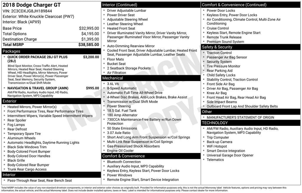 This Dodge Charger is well equipped and includes the following features and benefits, AWD, 300 HP Power Rating, 5-Year SiriusXM Traffic Service, 5-Year SiriusXM Travel Link Service, Auto Adjust In Reverse Exterior Mirrors, Auto-Dimming Exterior Driver Mirror, Bi-Function HID Projector Head Lamps, Blind Spot & Cross Path Detection, Blind Spot Memory/Power/Heat Mirror, Driver & Passenger Lower LED Lamps, Exterior Mirrors Courtesy Lamps, Front Overhead LED Lighting, Gloss Black Fascia Applique, Heated 2nd Row Seats, Heated Steering Wheel, Illuminated Rear Cupholders, Nappa Leather Sport Seat, Navigation & Travel Group, Performance Steering Wheel, Power Front Driver/Passenger Seats, Quick Order Package 28J GT Plus, R/T Front End Appearance, Radio: Uconnect 4C Nav w/8.4" Display, Radio/Driver Seat/Mirrors Memory, Security Alarm, SiriusXM Traffic Plus, SiriusXM Travel Link, Sport Mode, Steering Wheel Mounted Shift Control. Odometer is 18552 miles below market average! 18/27 City/Highway MPG