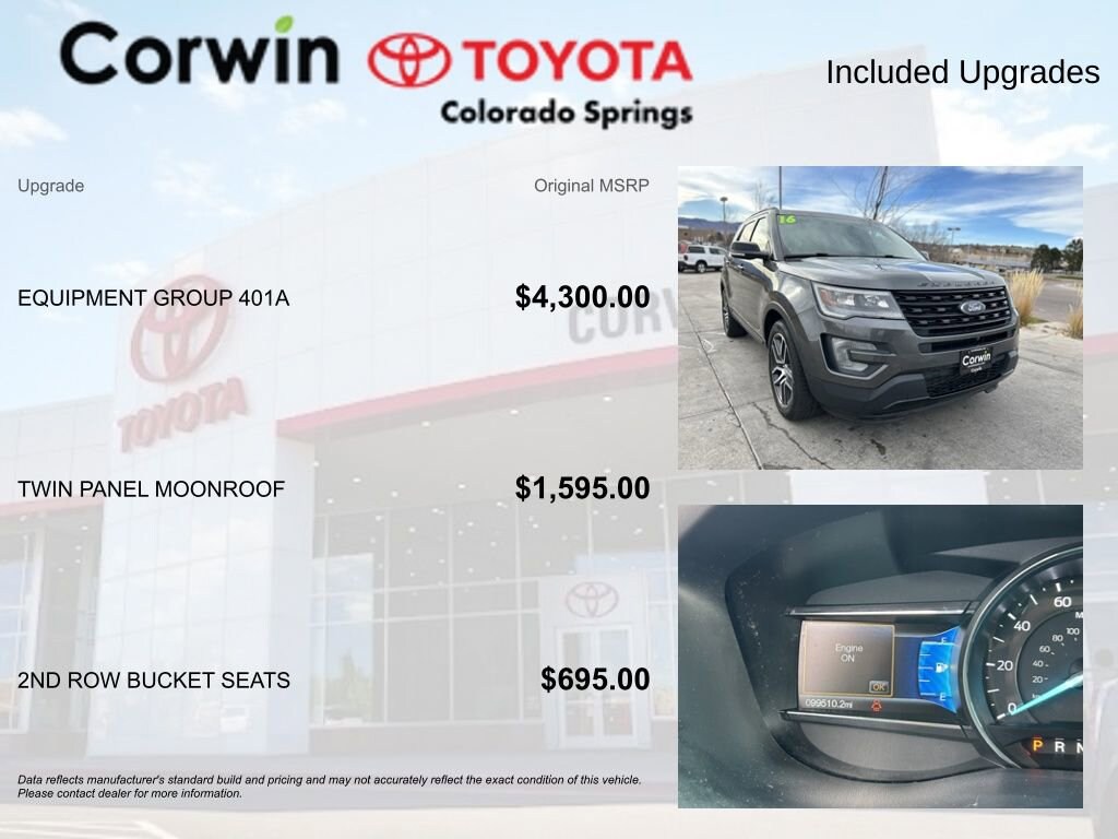 This Ford Explorer is well equipped and includes the following features and benefits, Sport 4WD, TWIN PANEL MOONROOF, 2ND ROW BUCKET SEATS, Equipment Group 401A, Ambient Lighting, BLIS Plus Inflatable Rear Safety Belts Package, Dual 2nd Row Smart Charging USB, Equipment Group 401A, Front 180 Degree Camera w/Washer, Hands-Free Liftgate, Heated Steering Wheel, Memory Feature, Perf Leather-Trimmed Heated/Cooled Bucket Seats, Power Adjustable Pedals, Power Converter 110V Outlet, Power Folding Sideview Mirrors w/Autofold, Power Tilt/Telescoping Steering Wheel, Universal Garage Door Opener, Voice-Activated Navigation System. Odometer is 6562 miles below market average!