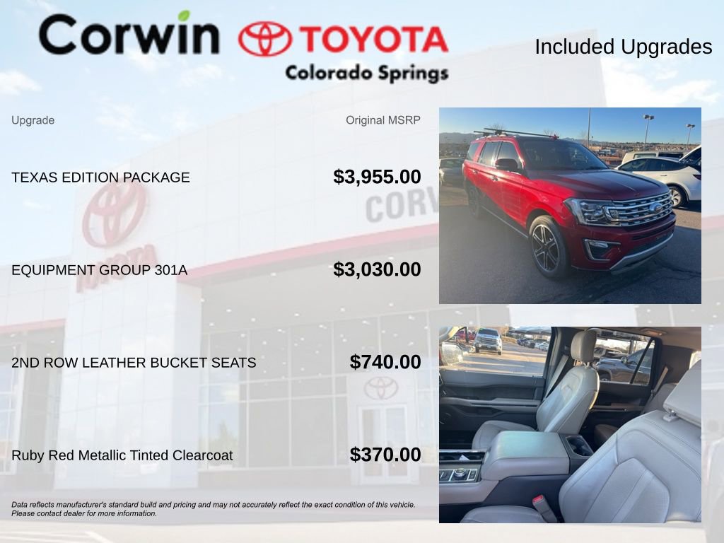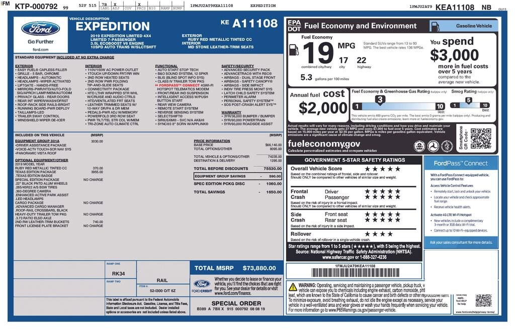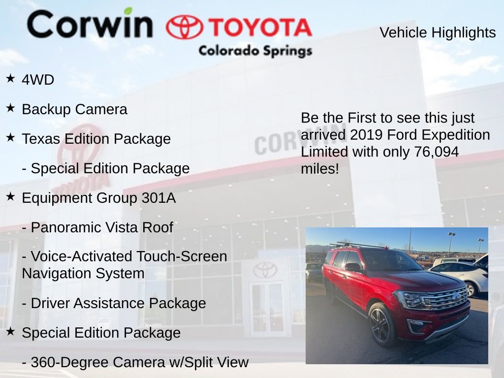 This Ford Expedition is well equipped and includes the following features and benefits, 4WD, Backup Camera, 360-Degree Camera w/Split View, Adaptive Cruise Control, Automatic High Beam Headlamps, Black Roof Rail Crossbars, Cargo Package, Driver Assistance Package, Electronic Limited Slip w/3.73 Axle Ratio, Enhanced Active Park Assist System, Equipment Group 301A, Heavy-Duty Engine Radiator, Heavy-Duty Trailer Tow Package, Integrated Trailer Brake Controller, Lane-Keeping System, LED Headlamps & Fog Lamps, Panoramic Vista Roof, Pre-Collision Assist, Pro Trailer Backup Assist, Rain-Sensing Front Wipers, Special Edition Package, Texas Edition Package, Voice-Activated Touch-Screen Navigation System, Wheels: 22" Premium Black-Painted Aluminum.