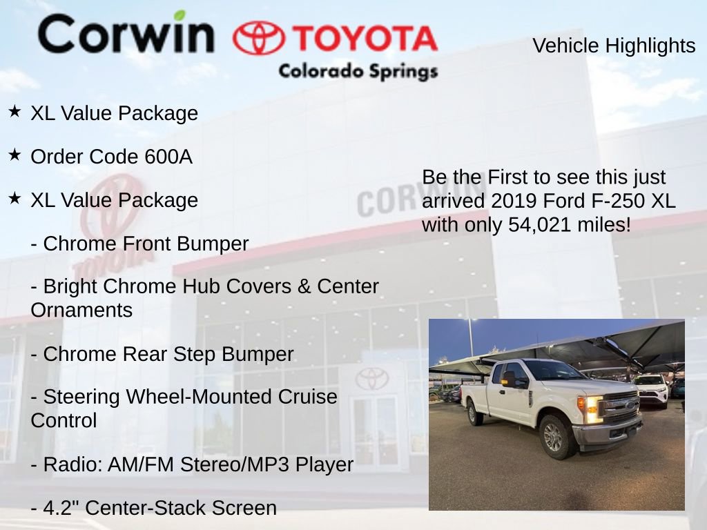 This Ford F-250SD is well equipped and includes the following features and benefits, XL Value Package, 4.2" Center-Stack Screen, ABS brakes, Bright Chrome Hub Covers & Center Ornaments, Chrome Front Bumper, Chrome Rear Step Bumper, Electronic Stability Control, GVWR: 10,000 lb Payload Package, Low tire pressure warning, Order Code 600A, Radio: AM/FM Stereo/MP3 Player, Steering Wheel-Mounted Cruise Control, Traction control, XL Value Package.