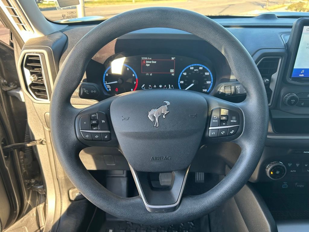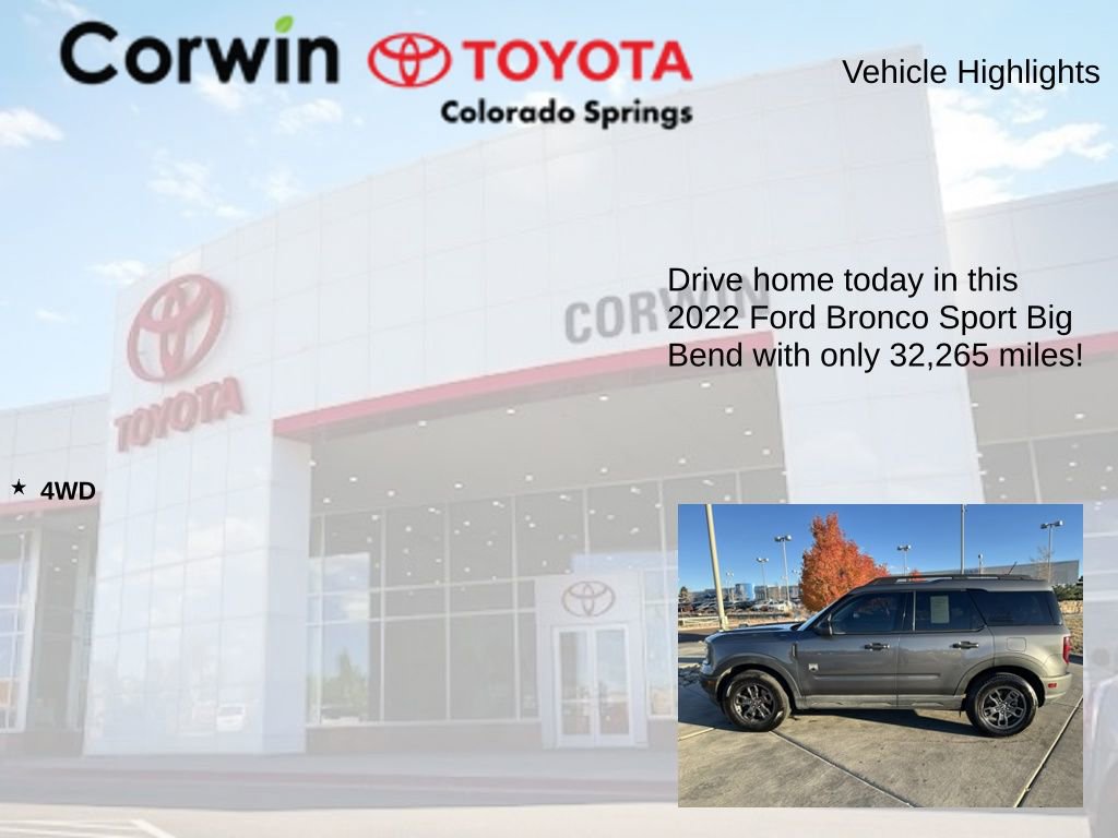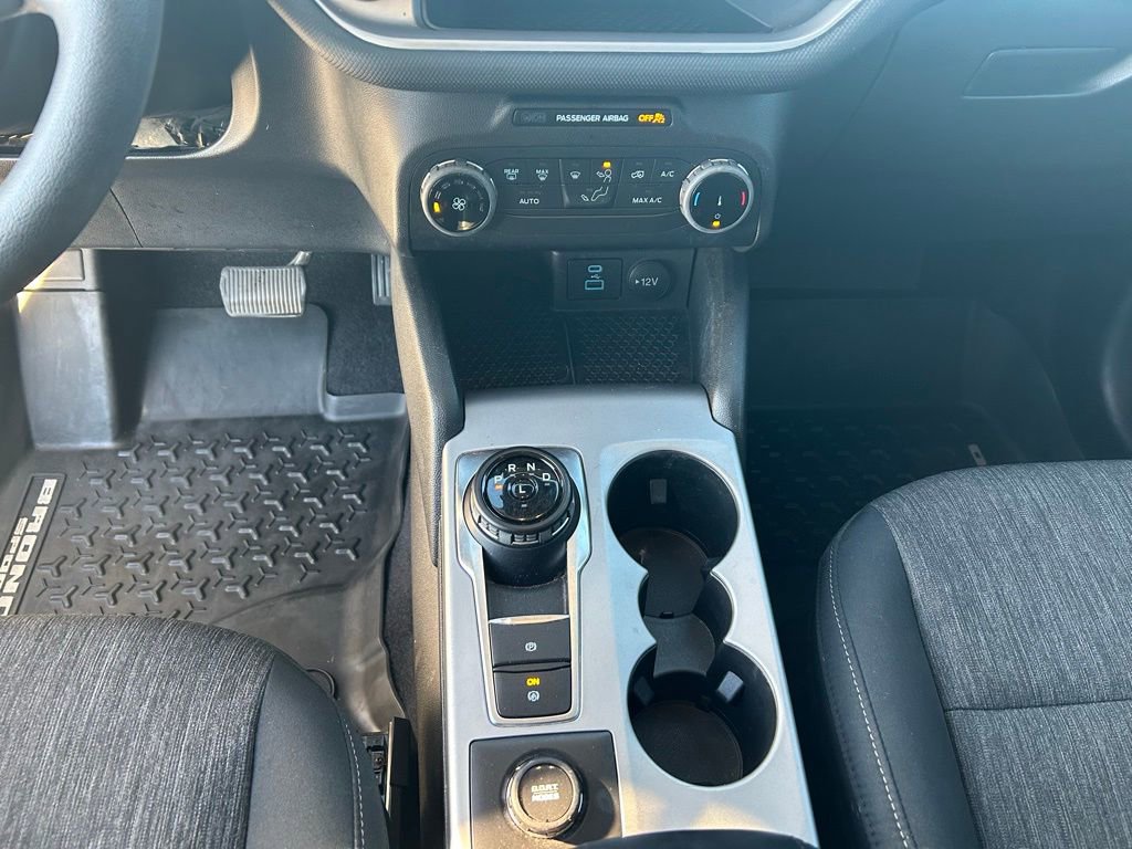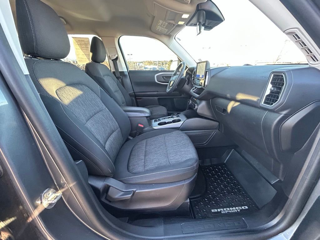 This Ford Bronco Sport is well equipped and includes the following features and benefits, 4WD, Safety Canopy System Curtain 1st And 2nd Row Airbags Side Impact Beams Dual Stage Driver And Passenger Seat-Mounted Side Airbags Ford Co-Pilot360 - BLIS (Blind Spot Information System) Blind Spot Ford Co-Pilot360 - Pre-Collision Assist with Automatic Emergency Braking (AEB) and Ford Co-Pilot360 - Cross-Traffic Alert Collision Mitigation-Front Driver Monitoring-Alert Tire Specific Low Tire Pressure Warning Dual Stage Driver And Passenger Front Airbags Ford Co-Pilot360 - Cross-Traffic Alert Airbag Occupancy Sensor Driver Knee Airbag Mykey System -inc: Top Speed Limiter, Audio Volume Limiter, Early Low Fuel Warning, Programmable Sound Chimes and Beltminder w/Audio Mute Rear Child Safety Locks Outboard Front Lap And Shoulder Safety Belts -inc: Rear Center 3 Point, Height Adjusters and Pretensioners Ford Co-Pilot360 - Reverse Camera Back-Up Camera w/Washer Reverse Camera Back-Up Camera w/Washer Ford Co-Pilot360 - Pre-Collision Assist with Automatic Emergency Braking (AEB), Headlights-Automatic Highbeams LED Brakelights Roof Rack Rails Only Liftgate Rear Cargo Access Flip-Up Rear Window w/Wiper and Defroster Flip-Up Rear Window w/Yes Wiper and Defroster Non-Metallic Paint Gray Grille Deep Tinted Glass Speed Sensitive Variable Intermittent Wipers Flip-Up Rear Window w/Fixed Interval Wiper and Defroster Black Power Heated Side Mirrors w/Manual Folding Black Door Handles Black Side Windows Trim Black Bodyside Cladding and Black Wheel Well Trim Black Rear Bumper Black Front Bumper Clearcoat Paint Compact Spare Tire Mounted Inside Under Cargo Steel Spare Wheel Fully Galvanized Steel Panels, Outside Temp Gauge Manual Adjustable Front Head Restraints and Manual Adjustable Rear Head Restraints Analog Appearance Seats w/Cloth Back Material Driver Information Center Systems Monitor Delayed Accessory Power Instrument Panel Bin, Driver / Passenger And Rear Door Bins Tracker System Cargo Space Lights Front Center Armrest and Rear Center Armrest Perimeter Alarm Securilock Anti-Theft Ignition (pats) Engine Immobilizer 3 12V DC Power Outlets Air Filtration Securilock Anti-Theft Ignition (pats) Immobilizer 6-Way Driver Seat -inc: Manual Recline, Height Adjustment and Fore/Aft Movement 4-Way Passenger Seat -inc: Manual Recline and Fore/Aft Movement Fade-To-Off Interior Lighting Vinyl/Rubber Floor Trim 60-40 Folding Bench Front Facing Manual Reclining Fold Forward Seatback Premium Cloth Rear Seat w/Manual Fore/Aft Passenger Seat Driver Seat Manual Tilt/Telescoping Steering Column FordPass Connect 4G Mobile Hotspot Internet Access Front Cupholder Rear Cupholder Compass Cruise Control w/Steering Wheel Controls Voice Activated Automatic Air Conditioning. Odometer is 17625 miles below market average! 25/28 City/Highway MPG