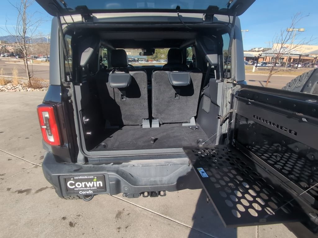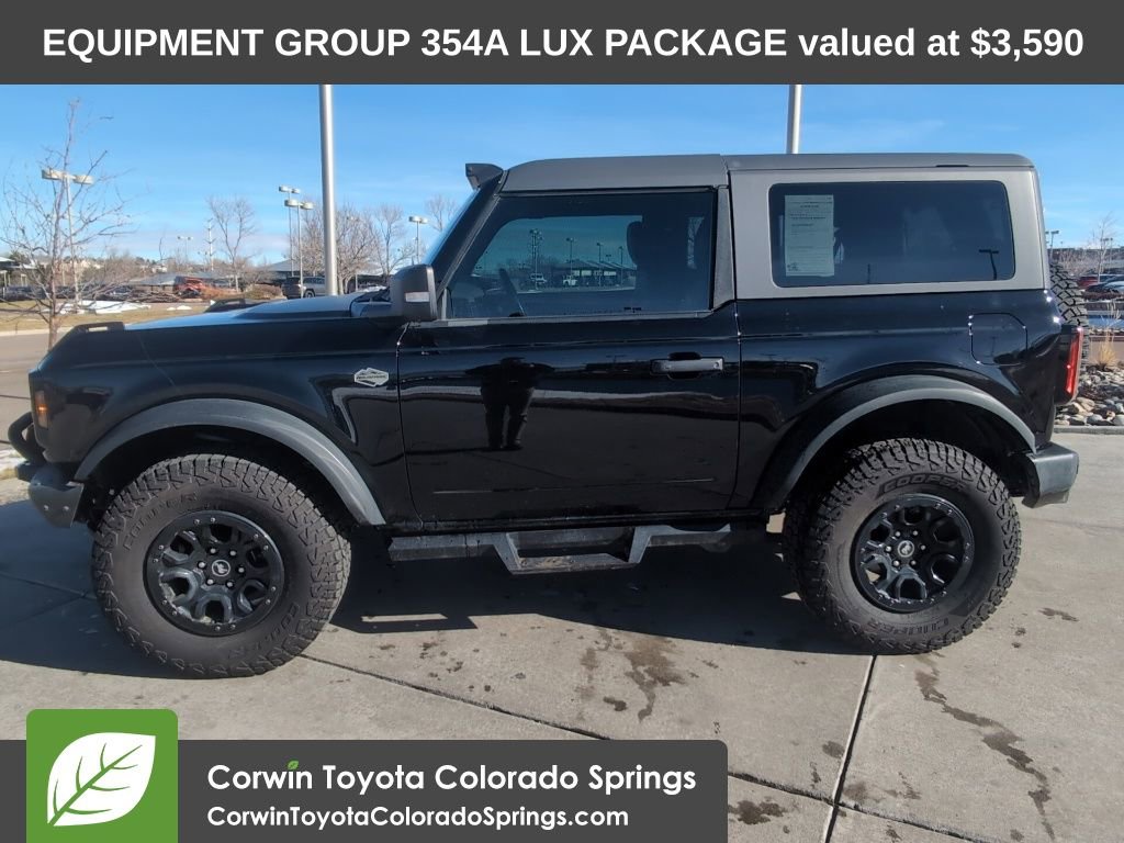 This Ford Bronco is well equipped and includes the following features and benefits, Wildtrak Lux Package, 12" LCD Capacitive Touchscreen w/Swipe Capability, 2 Smart Charging USB Ports In Dashboard, 360-Degree Camera, Adaptive Cruise Control, Additional Sound Deadening, Equipment Group 354A Lux Package, Evasive Steering Assist, Front Parking Sensors, Heated Steering Wheel, Information on Demand Panel, Navigation system: Connected Navigation, Radio: B&O Sound System by Bang & Olufsen, Sideview Mirrors, Universal Garage Door Opener, Wireless Charging Pad.