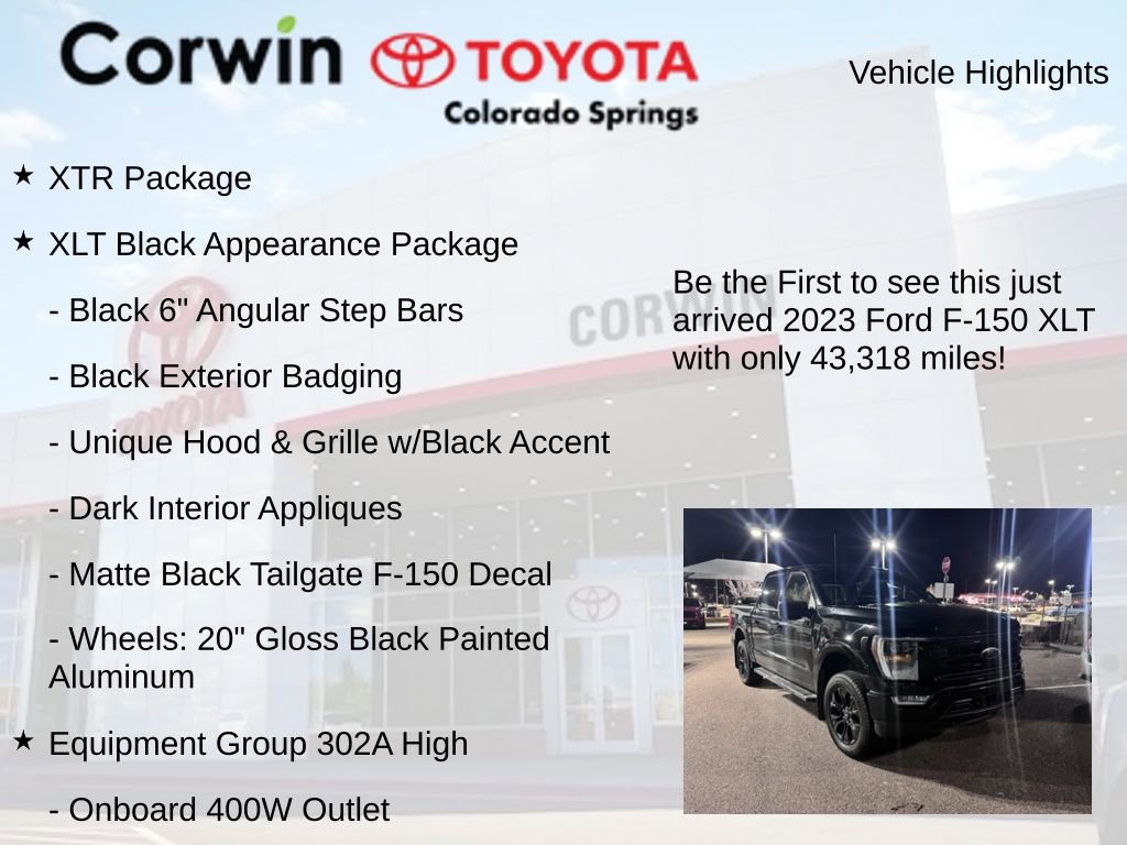 This Ford F-150 is well equipped and includes the following features and benefits, XTR Package, 10-Way Power Driver & Passenger Seats, 8" Productivity Screen in Instrument Cluster, Accent-Color Step Bars, Black 2-Bar Style Grille w/Black Surround/Accents, Black 6" Angular Step Bars, Black Exterior Badging, Body-Color Door & Tailgate Handles, Body-Color Front & Rear Bumpers, Box Side Decals, Class IV Trailer Hitch Receiver, Dark Interior Appliques, Dual Zone Electronic Automatic Temperature Control, Equipment Group 302A High, Heated Front Seats, Intelligent Access w/Push Button Start, LED Reflector Headlamps, LED Sideview Mirror Spotlights, Matte Black Tailgate F-150 Decal, Onboard 400W Outlet, Power Glass Heated Sideview Mirrors, Rear Under-Seat Storage, Remote Start System w/Remote Tailgate Release, SYNC 4 w/Enhanced Voice Recognition, Unique Hood & Grille w/Black Accent, Unique Sport Cloth 40/Console/40 Front-Seats, Wheels: 18" 6-Spoke Machined Aluminum, Wheels: 20" Gloss Black Painted Aluminum, Wrapped Steering Wheel, XLT Black Appearance Package, XLT Chrome Appearance Package, XLT Sport Appearance Package, Zone Lighting.