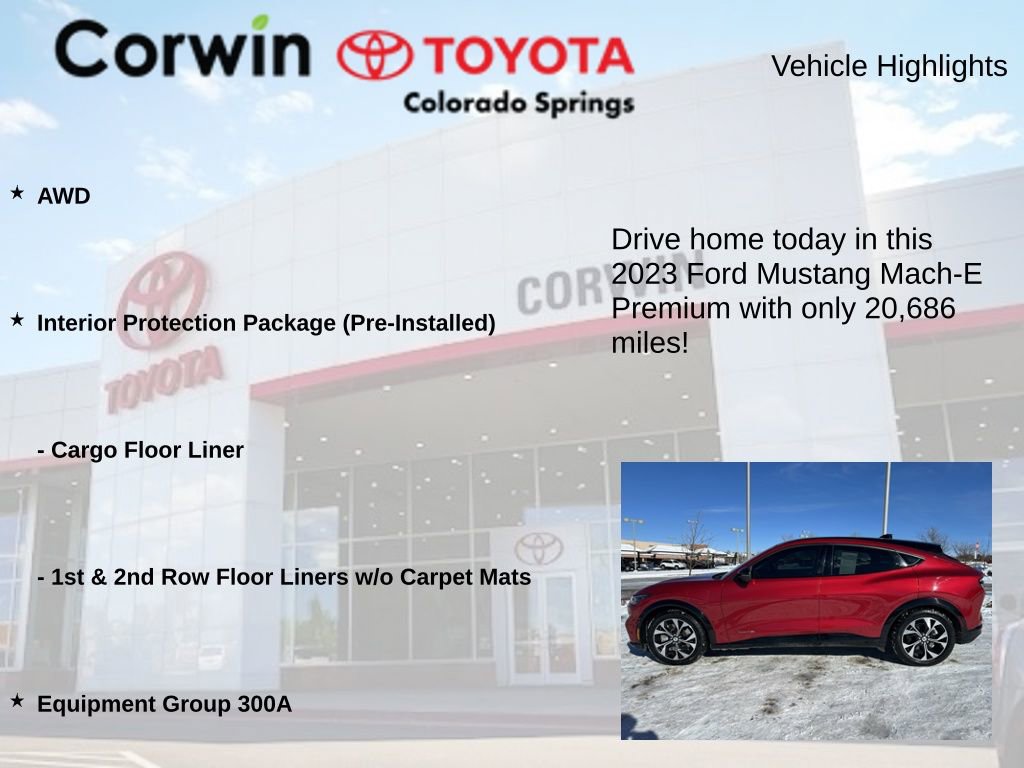 This Ford Mustang Mach-E is well equipped and includes the following features and benefits, AWD, 1st & 2nd Row Floor Liners w/o Carpet Mats, Cargo Floor Liner, Equipment Group 300A, Interior Protection Package (Pre-Installed). 99/86 City/Highway MPG