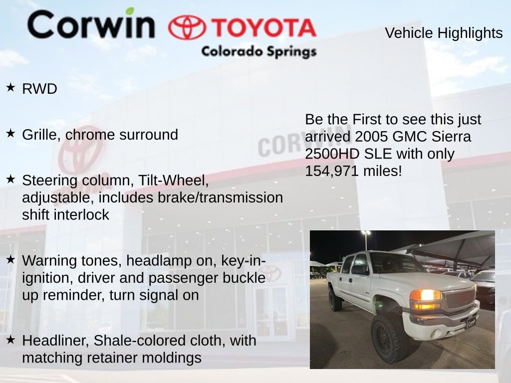 This GMC Sierra 2500HD is well equipped and includes the following features and benefits, RWD, Grille, chrome surround, Steering column, Tilt-Wheel, adjustable, includes brake/transmission shift interlock, Warning tones, headlamp on, key-in-ignition, driver and passenger buckle up reminder, turn signal on, Headliner, Shale-colored cloth, with matching retainer moldings, Cooling, external engine oil cooler, heavy-duty air-to-oil, integral to driver side of radiator tank, Pickup bed, Wideside box (May be substituted with (ZW9) Pickup bed, delete on T*259*3 Models).