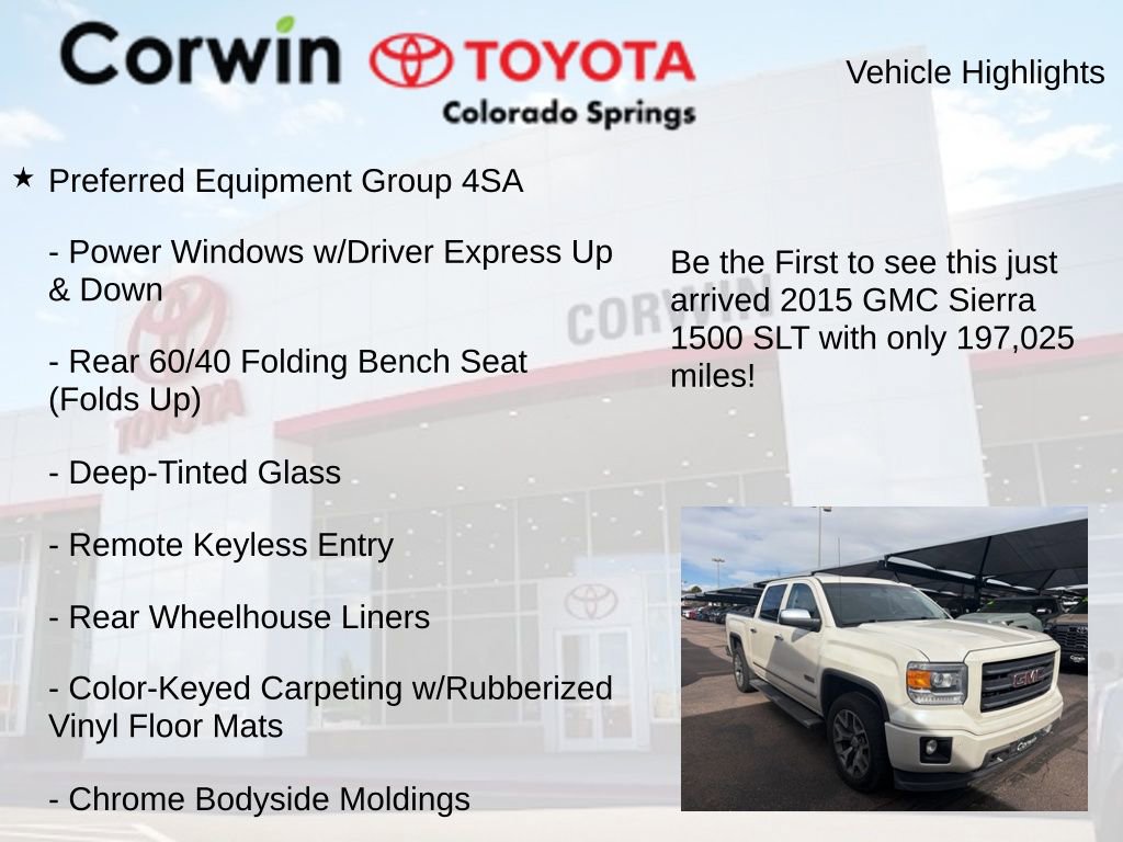 Discover the power and versatility of the 2015 GMC Sierra 1500 SLT. This well-equipped truck is ready to take on any challenge, whether you're hauling heavy loads, towing your trailer, or exploring off-road adventures.