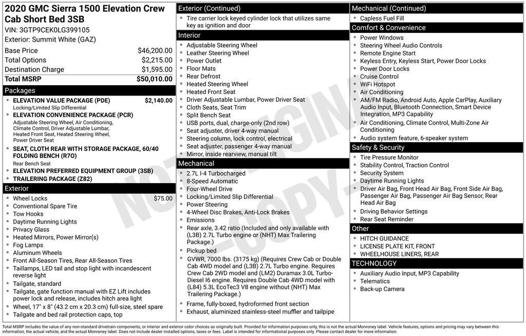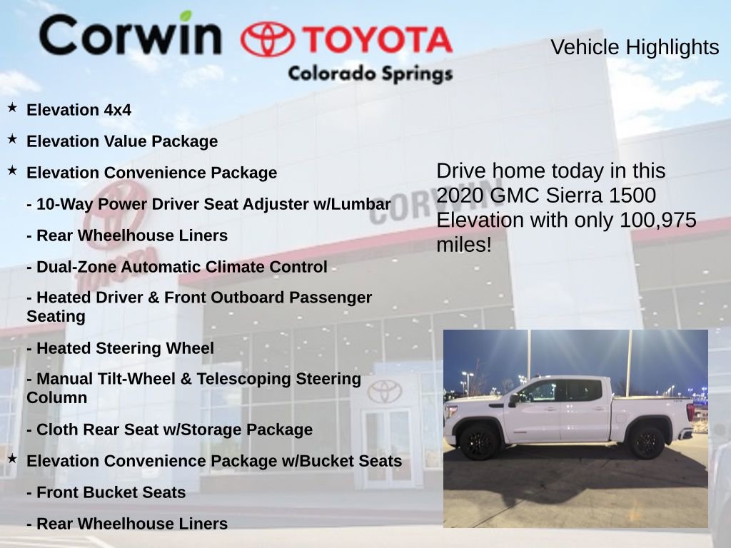 This GMC Sierra 1500 is well equipped and includes the following features and benefits, Elevation 4x4, Elevation Value Package, 10-Way Power Driver Seat Adjuster w/Lumbar, Cloth Rear Seat w/Storage Package, Dual-Zone Automatic Climate Control, Elevation Convenience Package, Elevation Convenience Package w/Bucket Seats, Elevation Value Package, Elevation Value Package w/PCU, Heated Driver & Front Outboard Passenger Seating, Heated Steering Wheel, Heavy-Duty Rear Locking Differential, Manual Tilt-Wheel & Telescoping Steering Column, Rear Wheelhouse Liners, Trailering Package. Odometer is 578 miles below market average!
