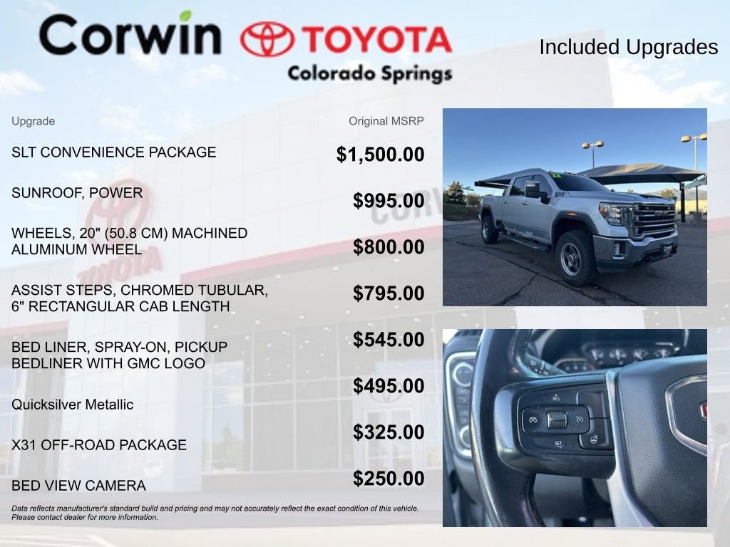 This GMC Sierra 2500HD is well equipped and includes the following features and benefits, 4WD, Backup Camera, Keyless Access with Push Button Start, Steering Wheel Mounted Controls, 12-Volt Rear Auxiliary Power Outlet, 120-Volt Bed Mounted Power Outlet, 120-Volt Instrument Panel Power Outlet, 2 USB Ports, 2 USB Ports (1st Row), 2-Speed Active Transfer Case, 2nd Row Dual USB Charge-Only Ports, 4.2" Diagonal Color Display Driver Info Center, Chrome Surround Grille w/High Gloss Black Mesh, Compass Located In Instrument Cluster, Deep-Tinted Glass, Electric Rear-Window Defogger, Electrical Lock Control Steering Column, Floor-Mounted Center Console, Front Bucket Seats, Heated & Ventilated Front Bucket Seats, Heated 2nd Row Outboard Seats, Hill Descent Control, Integrated Trailer Brake Controller, Keyless Open & Start, LED Cargo Area Lighting, LED Smoked Amber Roof Marker Lamps, Manual Tilt-Wheel/Telescoping Steering Column, Off-Road Suspension, OnStar & GMC Connected Services Capable, Power Door Locks, Power Front Passenger Windows w/Express Up/Down, Power Rear Windows w/Express Down, Power Sliding Rear Window w/Defogger, Power Windows w/Driver Express Up/Down, Preferred Equipment Group 4SA, Rear Wheelhouse Liners, Remote Vehicle Starter System, SLT Convenience Package, Steering Wheel Audio Controls, Suspension Package, Unauthorized Entry Theft-Deterrent System, Universal Home Remote, Wireless Phone Projection, X31 Off-Road Package.
