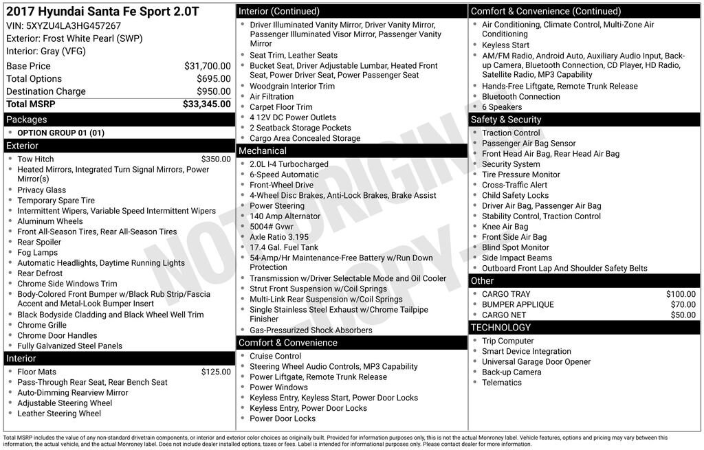 This Hyundai Santa Fe Sport is well equipped and includes the following features and benefits, Backup Camera, Heated Seats, Keyless Access with Push Button Start, Option Group 01. 20/28 City/Highway MPG