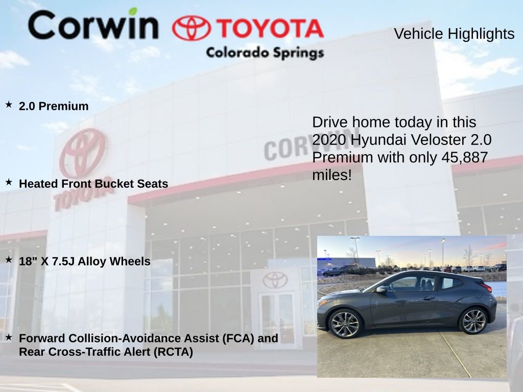 This Hyundai Veloster is well equipped and includes the following features and benefits, 2.0 Premium, Heated Front Bucket Seats, 18" X 7.5J Alloy Wheels, Forward Collision-Avoidance Assist (FCA) and Rear Cross-Traffic Alert (RCTA). Odometer is 16330 miles below market average! 27/34 City/Highway MPG