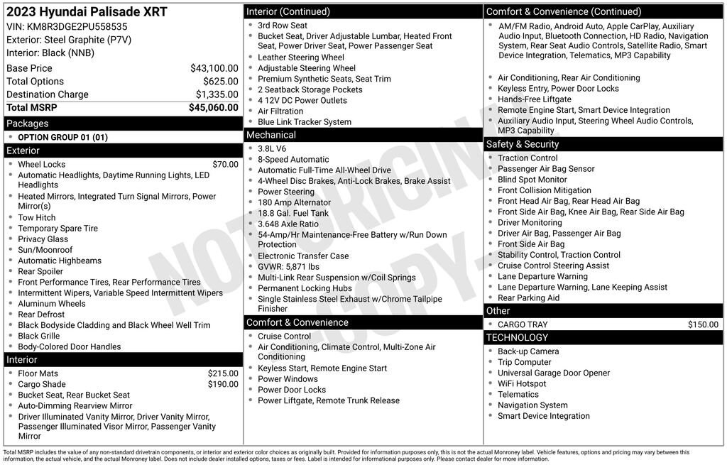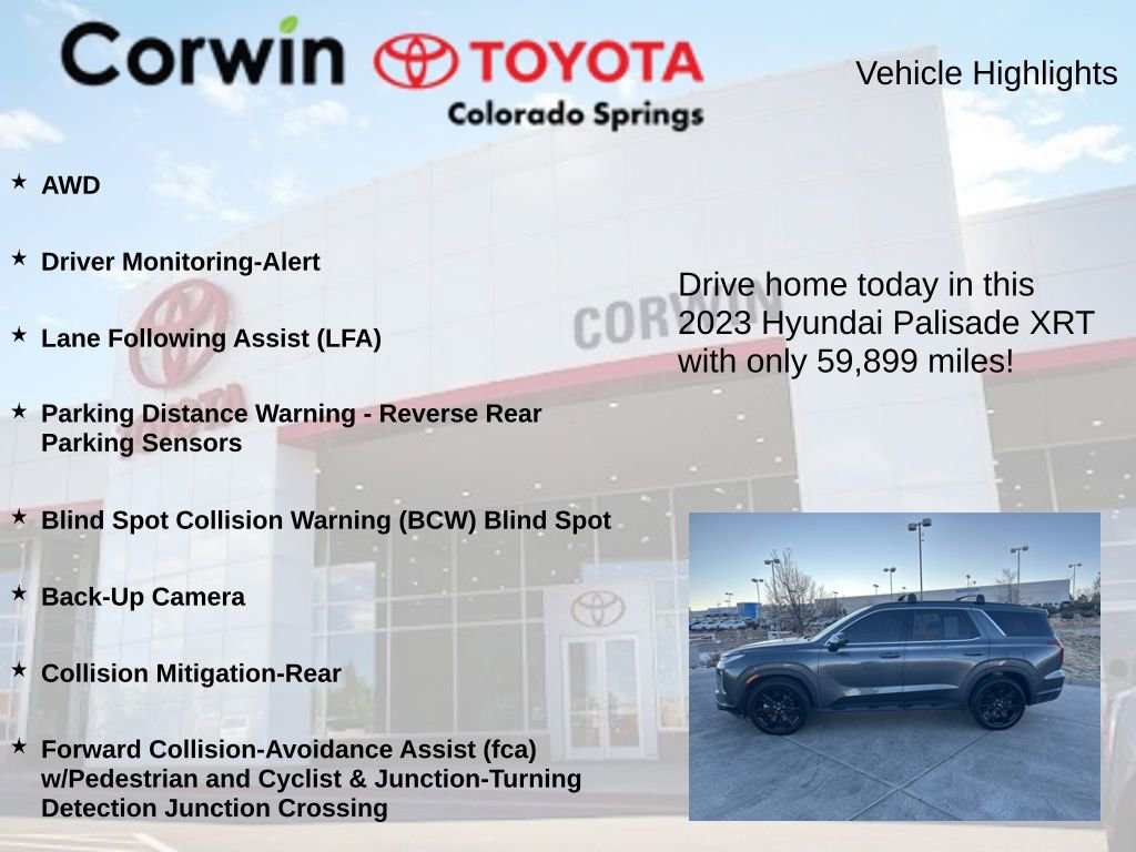 This Hyundai Palisade is well equipped and includes the following features and benefits, AWD, Driver Monitoring-Alert, Lane Following Assist (LFA), Parking Distance Warning - Reverse Rear Parking Sensors, Blind Spot Collision Warning (BCW) Blind Spot, Back-Up Camera, Collision Mitigation-Rear, Forward Collision-Avoidance Assist (fca) w/Pedestrian and Cyclist & Junction-Turning Detection Junction Crossing.