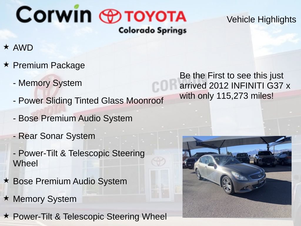 This INFINITI G37 is well equipped and includes the following features and benefits, AWD, Bose Premium Audio System, Memory System, Power Sliding Tinted Glass Moonroof, Power-Tilt & Telescopic Steering Wheel, Premium Package, Rear Sonar System. Odometer is 17708 miles below market average!