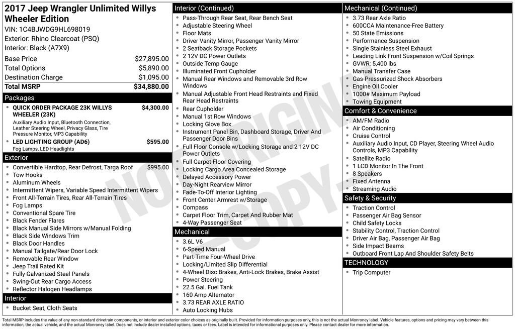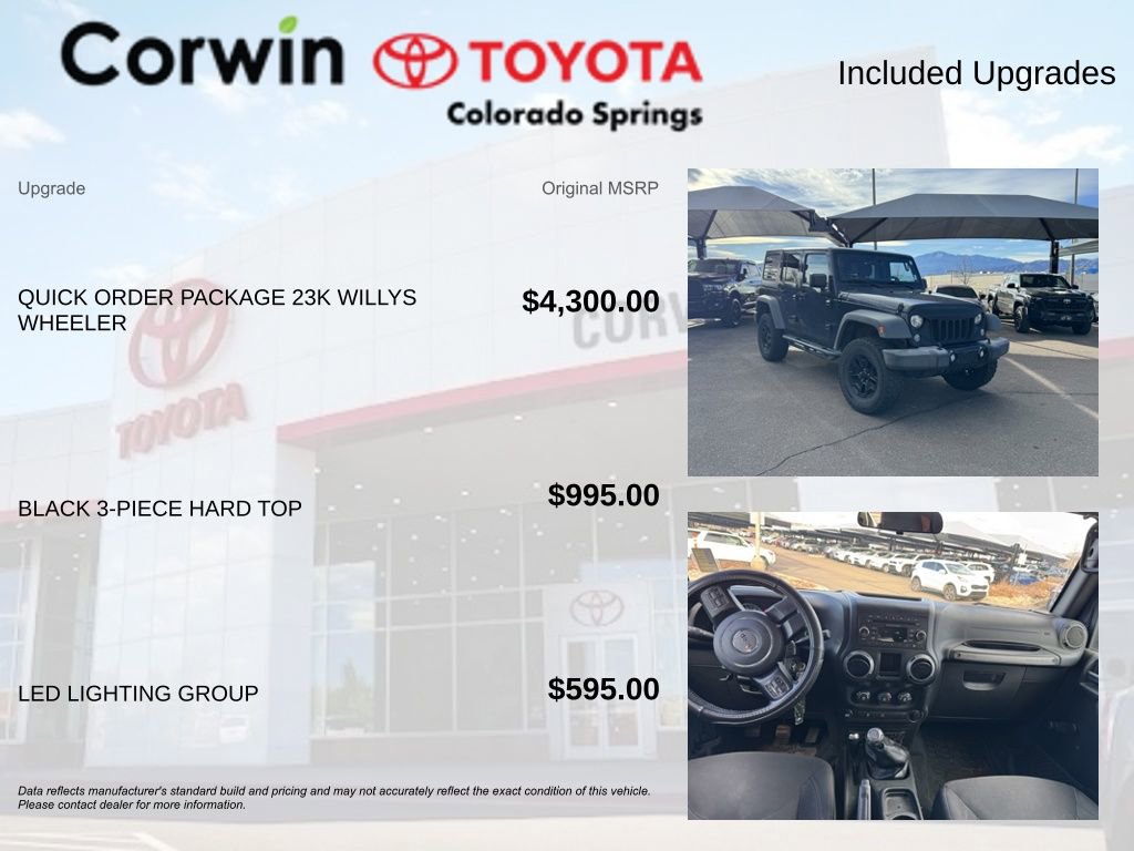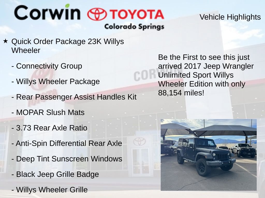 This Jeep Wrangler is well equipped and includes the following features and benefits, 3.73 Rear Axle Ratio, 4-Wheel Drive Swing Gate Decal, Anti-Spin Differential Rear Axle, Black Jeep Grille Badge, Connectivity Group, Deep Tint Sunscreen Windows, Jeep Trail Rated Kit, LED Fog Lamps, LED Lighting Group, LED Reflector Headlamps, MOPAR Slush Mats, Performance Suspension, Quick Order Package 23K Willys Wheeler, Rear Passenger Assist Handles Kit, SIRIUS Satellite Radio, Wheels: 17" x 7.5" High Gloss Black Willys, Willys Hood Decal, Willys Wheeler Grille, Willys Wheeler Package.