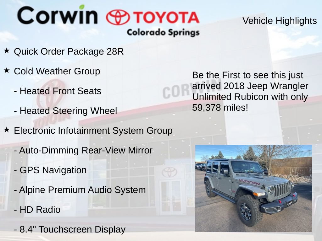 This Jeep Wrangler is well equipped and includes the following features and benefits, 1-Year SiriusXM Guardian Trial, 5-Year SiriusXM Traffic Service, 5-Year SiriusXM Travel Link Service, 8.4" Touchscreen Display, Alpine Premium Audio System, Auto-Dimming Rear-View Mirror, Black 3-Piece Hard Top, Cold Weather Group, Dual Top Group, Electronic Infotainment System Group, GPS Navigation, HD Radio, Heated Front Seats, Heated Steering Wheel, Premium Black Sunrider Soft Top w/Dual Top Group, Quick Order Package 28R, Radio: Uconnect 4C Nav w/8.4" Display, Roadside Assistance & 9-1-1 Call, SiriusXM Traffic Plus, SiriusXM Travel Link.