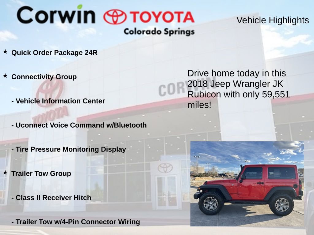 Whether you're seeking a capable adventure vehicle, a versatile daily driver, or a true icon of American automotive heritage, this 2018 Jeep Wrangler JK Rubicon is an exceptional choice. Experience the freedom and capability that only a Wrangler can deliver. Visit us today to take this remarkable Jeep for a test drive and discover how it can enhance your driving experience.
