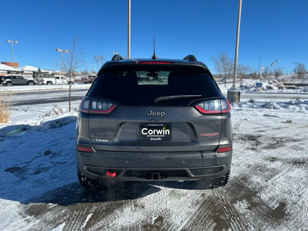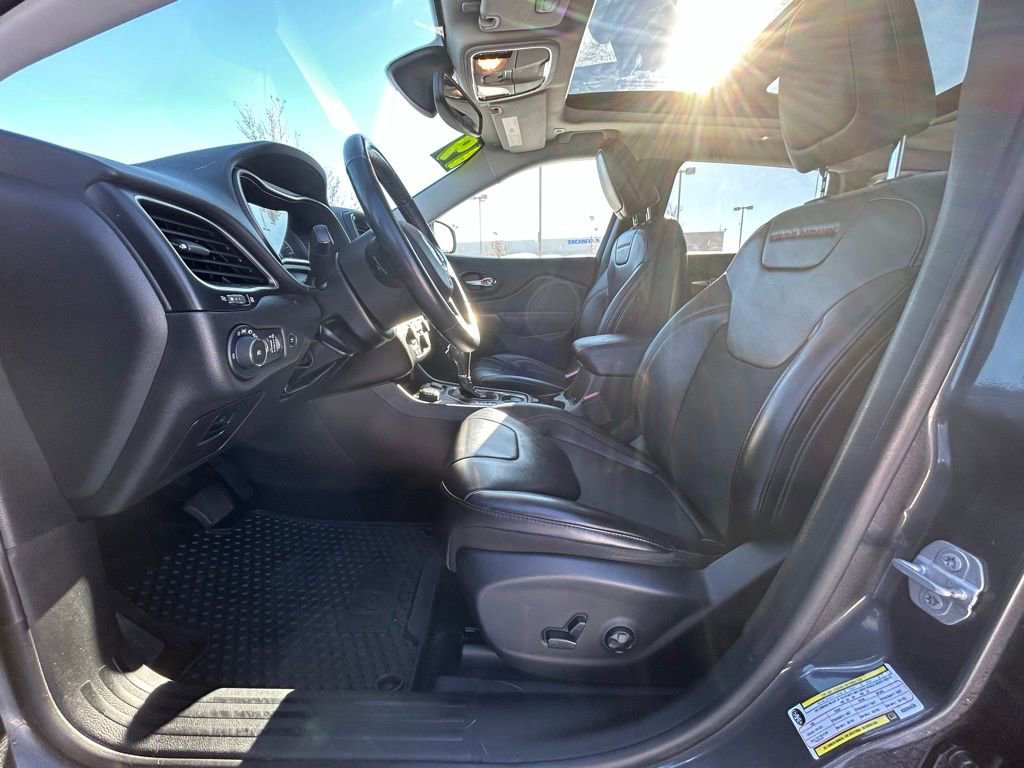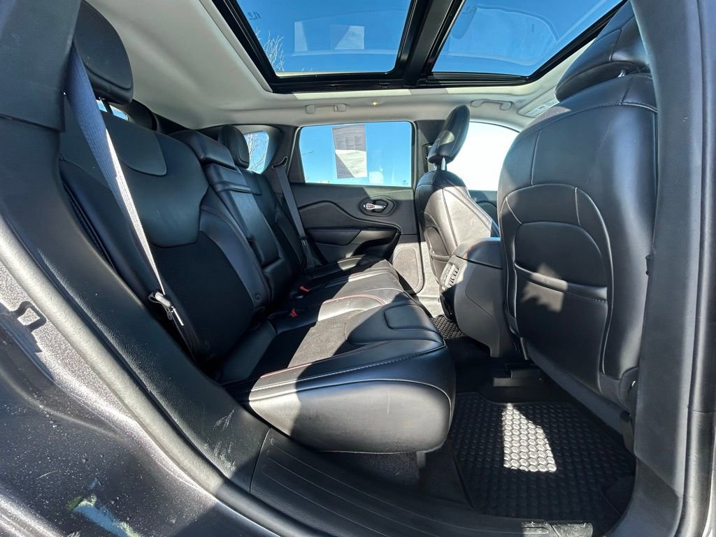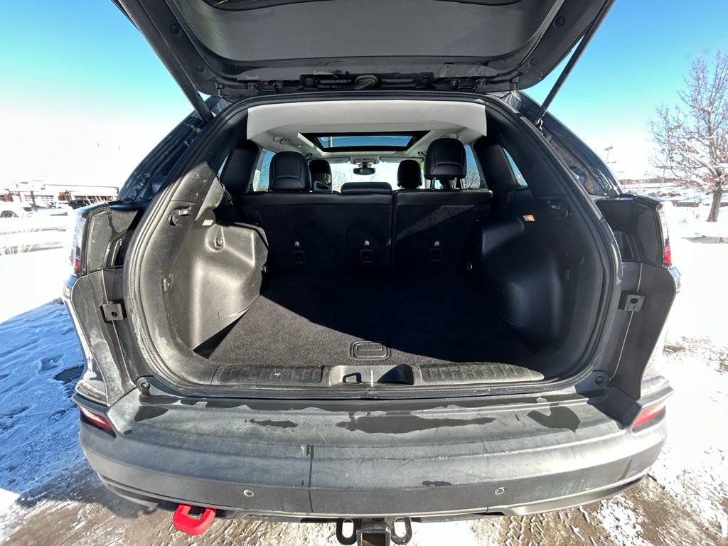 This Jeep Cherokee is well equipped and includes the following features and benefits, 7 & 4 Pin Wiring Harness, Auto-Dimming Rear-View Mirror, Auxiliary Transmission Oil Cooler, Class III Receiver Hitch, Cold Weather Group, Comfort/Convenience Group, Engine Block Heater, Heated Front Seats, Heated Steering Wheel, Power Liftgate, Quick Order Package 27E Trailhawk, Remote Start System, Security Alarm, Trailer Tow Group, Trailer Tow Wiring Harness, Universal Garage Door Opener, Windshield Wiper De-Icer. Odometer is 19805 miles below market average!