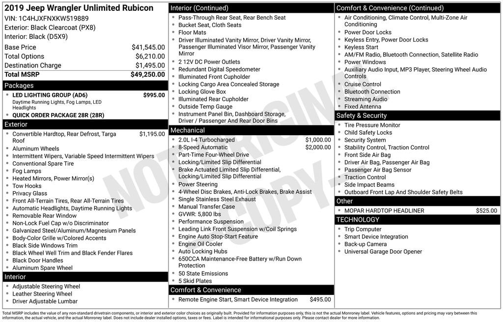 Elevate your driving experience with the MOPAR Hardtop Headliner and enjoy the convenience of the Remote Start System. Indulge in the comfort of the Premium Cloth Low-Back Bucket Seats and stay connected with the Uconnect 4 infotainment system with 7" display, featuring Apple CarPlay and Android Auto.