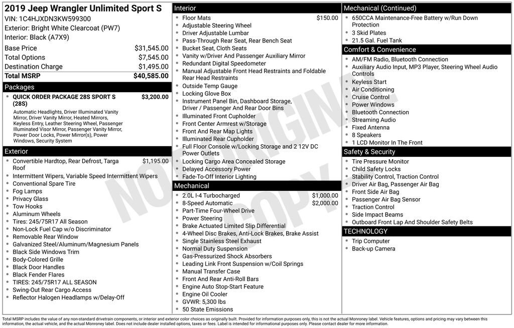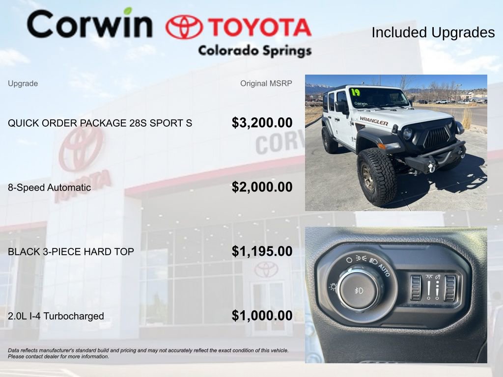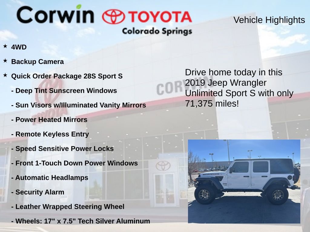 Discover the exceptional 2019 Jeep Wrangler Unlimited Sport S, a versatile and capable off-road companion that blends rugged performance with modern convenience. This well-equipped Wrangler boasts a host of features that make it the perfect choice for the adventurous spirit.