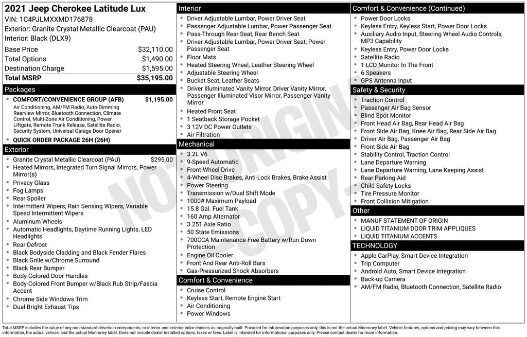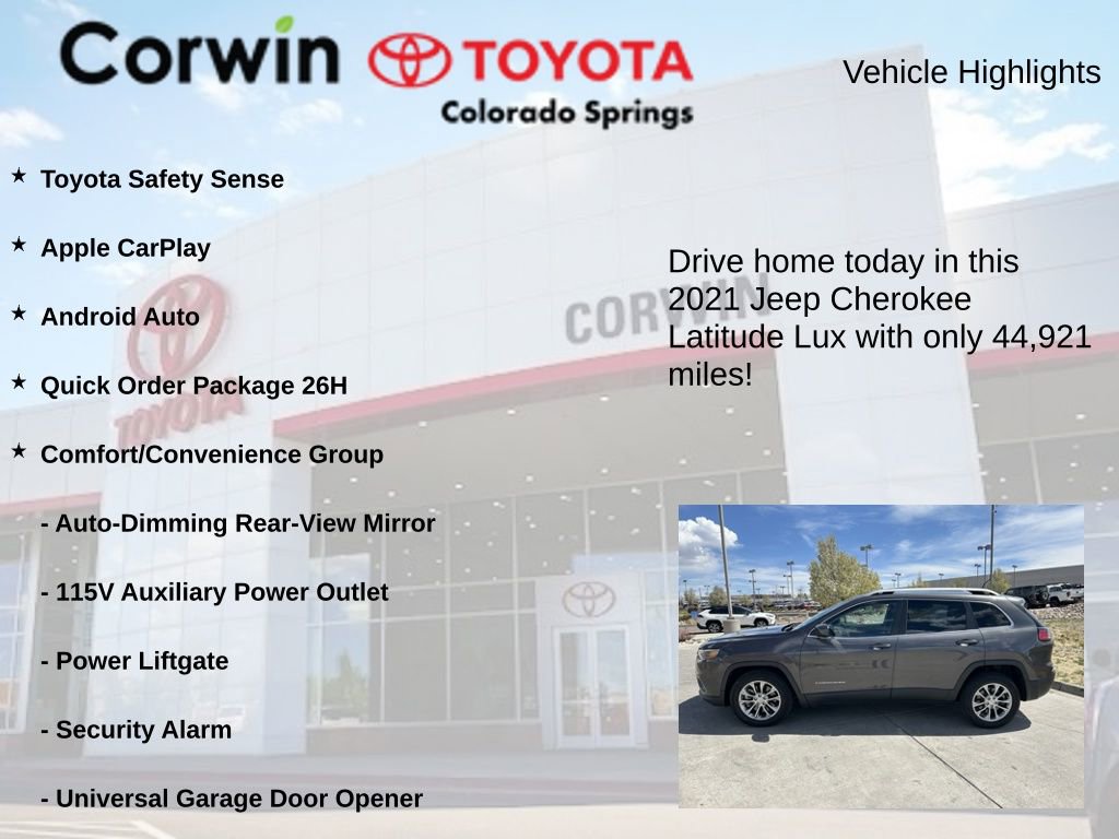 This 2021 Jeep Cherokee Latitude Lux is the perfect blend of style, capability, and technology, making it an exceptional choice for those seeking a versatile and well-equipped SUV. Experience the difference for yourself by scheduling a test drive today. We're confident you'll be impressed by all this vehicle has to offer.