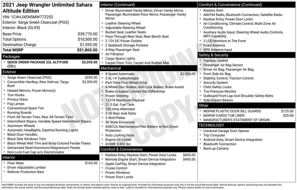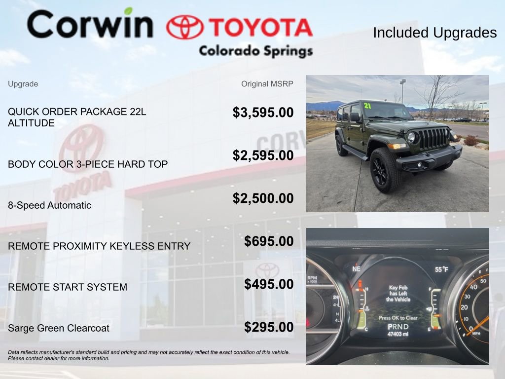 This Jeep Wrangler is well equipped and includes the following features and benefits, 4WD, Tire Specific Low Tire Pressure Warning Dual Stage Driver And Passenger Front Airbags Airbag Occupancy Sensor Rear Child Safety Locks Outboard Front Lap And Shoulder Safety Belts -inc: Rear Center 3 Point, Height Adjusters and Pretensioners ParkView Back-Up Camera Dual Stage Driver And Passenger Seat-Mounted Side Airbags Side Impact Beams, Clearcoat Paint Swing-Out Rear Cargo Access Flip-Up Rear Window Non-Metallic Paint Tires: 255/70R18 All Terrain Full-Size Spare Tire Mounted Outside Rear Black Side Windows Trim Black Door Handles Deep Tinted Glass Non-Lock Fuel Cap w/o Discriminator Conventional Rear Cargo Access Convertible w/Fixed Roll-Over Protection Galvanized Steel/Aluminum/Magnesium Panels Variable Intermittent Wipers Black Wheel Well Trim and Body-Colored Fender Flares, 2 12V DC Power Outlets and 1 Interior 120V AC Power Outlet Full Floor Console w/Locking Storage, 2 12V DC Power Outlets and 1 Interior 120V AC Power Outlet 60-40 Folding Split-Bench Front Facing Fold Forward Seatback Cloth Rear Seat Driver Information Center 2 Seatback Storage Pockets Sentry Key Immobilizer Trip Computer Power 1st Row Windows w/Driver And Passenger 1-Touch Down 6-Way Driver Seat -inc: Manual Recline, Height Adjustment, Fore/Aft Movement and Manual Lumbar Support Air Filtration HVAC -inc: Console Ducts Cargo Space Lights Locking Cargo Area Concealed Storage Carpet Floor Trim, Carpet And Rubber Mat Fade-To-Off Interior Lighting Front And Rear Map Lights Full Floor Console w/Locking Storage, 2 12V DC Power Outlets and 1 120V AC Power Outlet Driver And Passenger Visor Vanity Mirrors w/Driver And Passenger Illumination Day-Night Rearview Mirror MOPAR Hardtop Headliner Interior Trim -inc: Metal-Look Door Panel Insert and Metal-Look Interior Accents Locking Glove Box Sentry Key Engine Immobilizer Voice Activated Dual Zone Front Automatic Air Conditioning Cruise Control w/Steering Wheel Controls Garage Door Transmitter. Odometer is 3923 miles below market average!