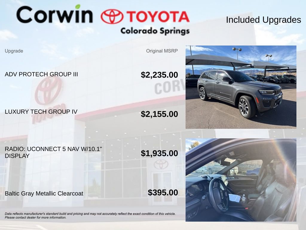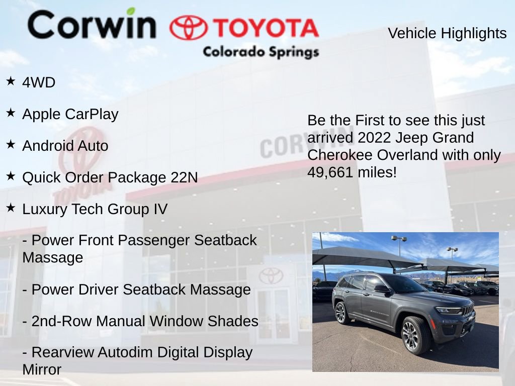 This Jeep Grand Cherokee is well equipped and includes the following features and benefits, 4WD, Apple CarPlay, Android Auto, 12-Way Power Adjust Driver Seat, 12-Way Power Adjust Front Passenger Seat, 2nd-Row Manual Window Shades, Active Driving Assist System, ADV Protech Group III, ATC w/4-Zone Temp Control, Heads-Up Display, Highway Assist System, Integrated Off-Road Camera, Intersection Collision Assist System, Luxury Tech Group IV, Map-In-Cluster Display, Nappa Leather Seats w/AAM, Night Vision w/Pedestrian-Animal Detection, Passenger Seat Memory, Power Driver Seatback Massage, Power Front Passenger Seatback Massage, Quick Order Package 22N, Rear Back-Up Camera Washer, Rearview Autodim Digital Display Mirror, Surround View Camera System, Wireless Charging Pad. Odometer is 4221 miles below market average! 19/26 City/Highway MPG