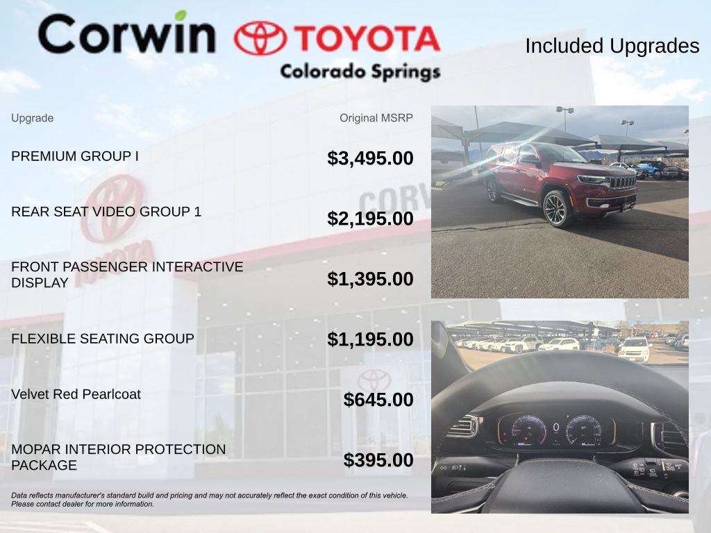 This Jeep Wagoneer is well equipped and includes the following features and benefits, Premium 4WD, 3 Panel Sunroof, 60/40 Power Recline 3rd Row Seat, 7-Passenger Seating, Adjustable Roof Rail Crossbars, All-Season Floor Mats, Amazon Fire TV Built-In, Cargo Cover, Cargo Tray, Flexible Seating Group, Floor Console w/Cupholder, MOPAR Interior Protection Package, Power Tip/Slide Recline 2nd Row Buckets, Premium Group I (DISC), Quick Order Package 22J, Rear Seat Video Group 1, Reversible Carpet/Vinyl Cargo Mat, Seatback Video Screens, Video USB Port.
