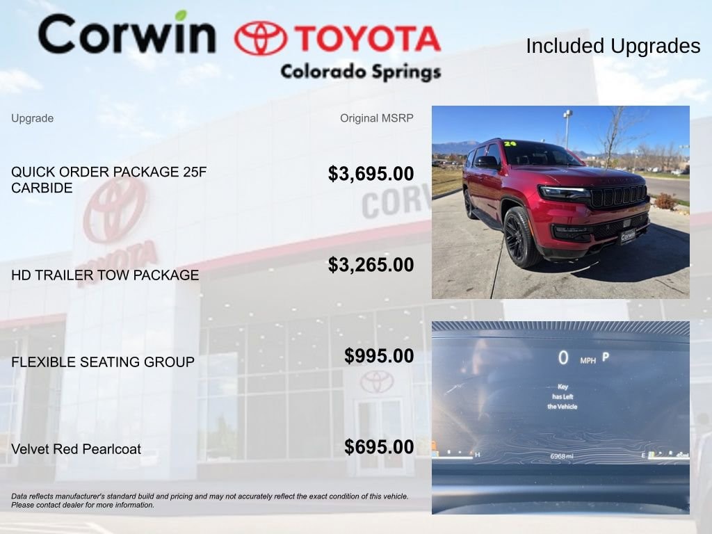 This Jeep Wagoneer is well equipped and includes the following features and benefits, 4WD, Apple CarPlay, Android Auto, Adaptive Cruise Control, Heated Seats, 2 Speed On Demand Transfer Case, 3 Panel Sunroof, 3.92 Rear Axle Ratio, 40/20/40 2nd Row Bench Power Tip/Slide, 60/40 Power Recline 3rd Row Seat, 8-Passenger Seating, Adjustable Roof Rail Crossbars, Black Interior Accents, Carbide Appearance Package, Cargo Cover, Electronic Rear Limited Slip Differential, Flexible Seating Group, Full Length Floor Console, HD Trailer Tow Package, Heavy-Duty Engine Cooling, Piano Black Exterior Accents, Quick Order Package 25F Carbide, Removable Rear Tow Hook, Reversible Carpet/Vinyl Cargo Mat, Selec-Speed Control, Trailer Brake Control, Trailer Hitch Zoom, Wheels: 20" x 9" Gloss Black Painted Aluminum. Odometer is 32198 miles below market average!