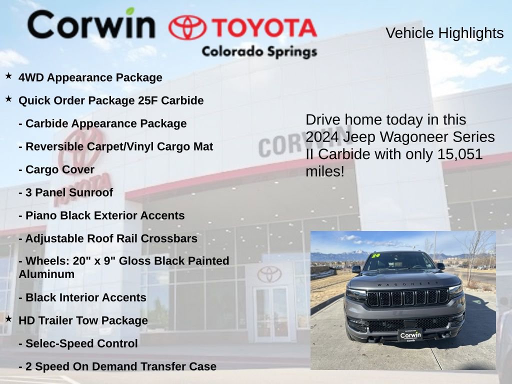 Designed with your comfort and convenience in mind, the Wagoneer Series II boasts a host of premium features, including a 3-panel sunroof, adjustable roof rail crossbars, and a reversible cargo mat. The Carbide Appearance Package and HD Trailer Tow Package further enhance the vehicle's bold, confident styling and towing capabilities, making it the perfect companion for your adventures.