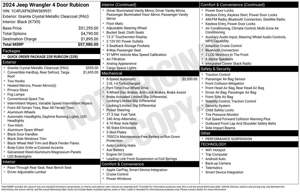 This Jeep Wrangler is well equipped and includes the following features and benefits, Quick Order Package 22R Rubicon. Odometer is 11957 miles below market average!