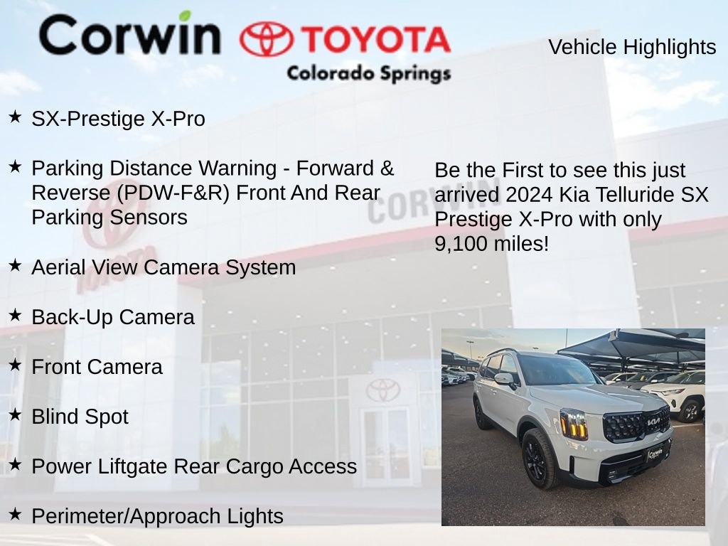 This Kia Telluride is well equipped and includes the following features and benefits, SX-Prestige X-Pro, Parking Distance Warning - Forward & Reverse (PDW-F&R) Front And Rear Parking Sensors, Aerial View Camera System, Back-Up Camera, Front Camera, Blind Spot, Power Liftgate Rear Cargo Access, Perimeter/Approach Lights. Odometer is 20489 miles below market average!