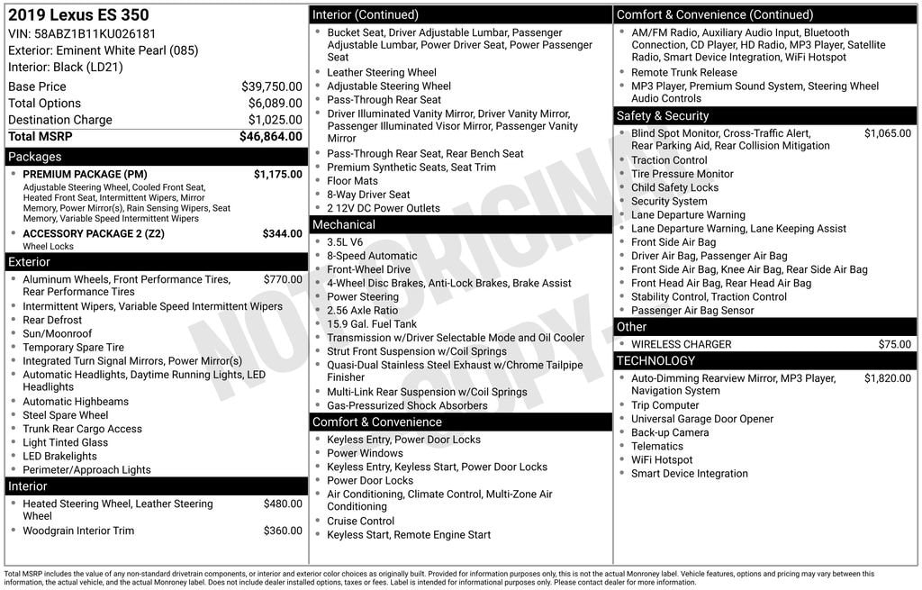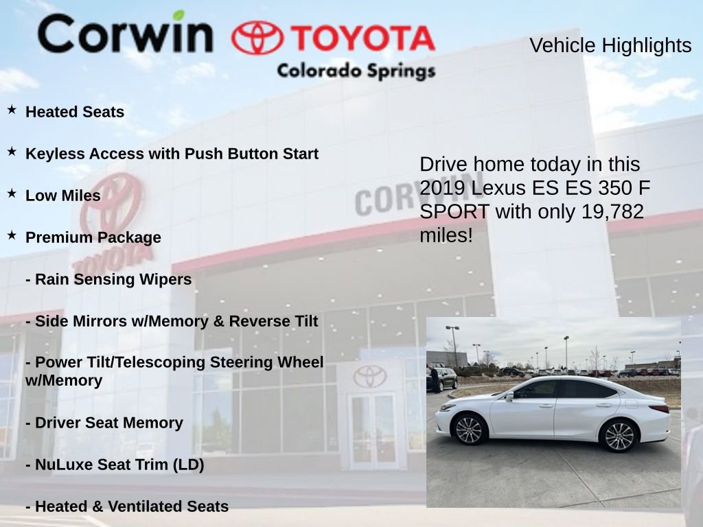 This exceptional 2019 Lexus ES 350 is a true testament to the brand's commitment to quality, innovation, and customer satisfaction. Experience the pinnacle of luxury and performance by scheduling a test drive today. We look forward to the opportunity to demonstrate the exceptional capabilities of this remarkable vehicle and assist you in making an informed purchasing decision.