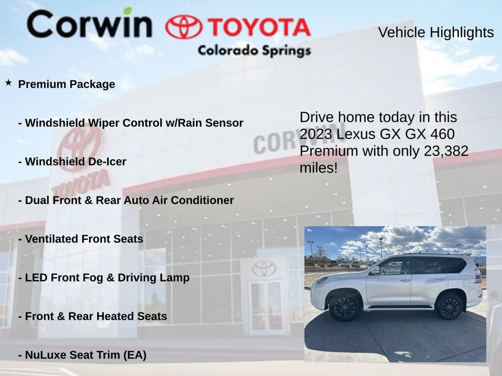 Elevate your driving experience with the uncompromising luxury and capability of this 2023 Lexus GX 460. Crafted to exceed your expectations, this exceptional SUV is the perfect companion for your adventures, whether navigating the city streets or exploring the great outdoors. Contact us today to schedule a test drive and discover the difference for yourself.