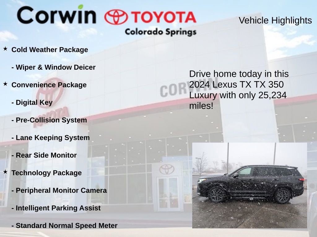 This Lexus TX is well equipped and includes the following features and benefits, ABS brakes, Alloy wheels, Cold Weather Package, Convenience Package, Digital Inner Mirror, Digital Key, Electronic Stability Control, Front dual zone A/C, Head-Up Display, Heated door mirrors, Heated front seats, Heated rear seats, Illuminated entry, Intelligent Parking Assist, Lane Keeping System, Low tire pressure warning, Peripheral Monitor Camera, Power Liftgate, Power moonroof, Pre-Collision System, Rear Side Monitor, Remote keyless entry, Standard Normal Speed Meter, Technology Package, Traction control, Wiper & Window Deicer. Odometer is 1537 miles below market average! 20/26 City/Highway MPG
