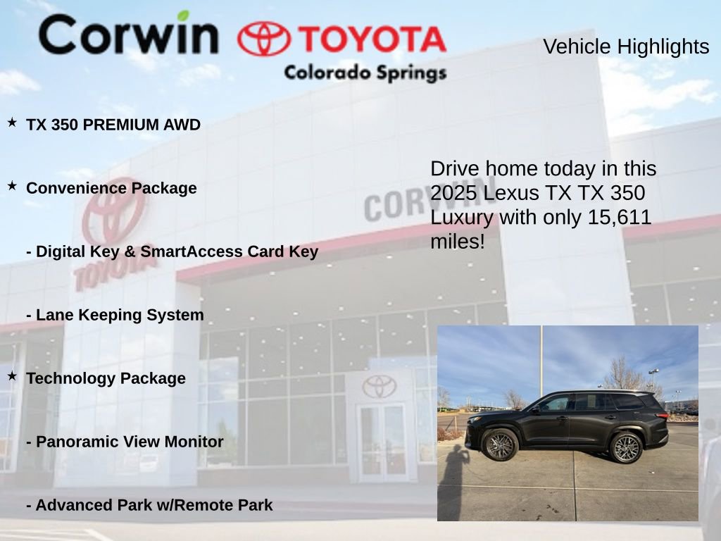 This Lexus TX is well equipped and includes the following features and benefits, TX 350 PREMIUM AWD, Advanced Park w/Remote Park, Convenience Package, Digital Key & SmartAccess Card Key, Digital Rearview Mirror, Head-Up Display, Lane Keeping System, Panoramic View Monitor, Technology Package. 20/26 City/Highway MPG