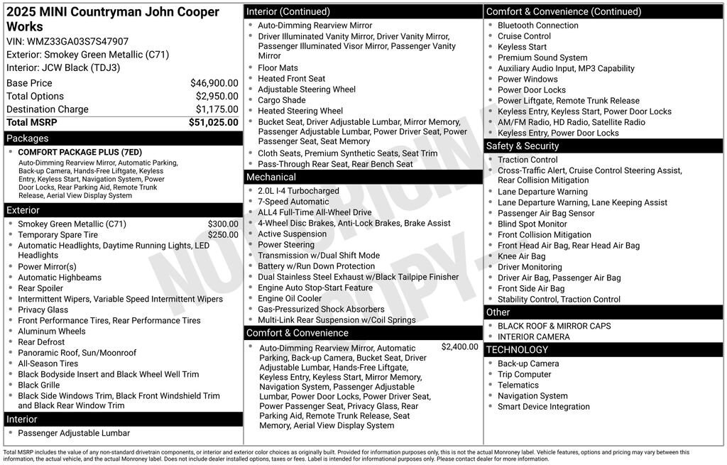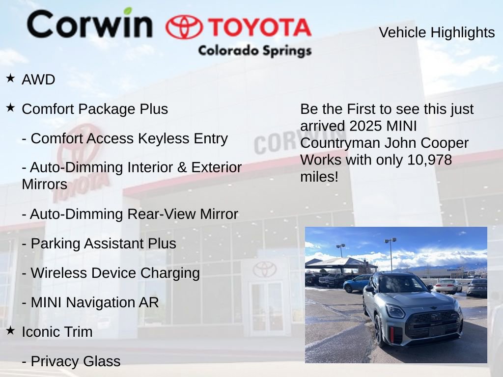 This MINI John Cooper Works Countryman is well equipped and includes the following features and benefits, AWD, Auto-Dimming Interior & Exterior Mirrors, Auto-Dimming Rear-View Mirror, Comfort Access Keyless Entry, Comfort Package Plus, Iconic Trim, Interior Camera, MINI Navigation AR, Parking Assistant Plus, Power Front Seats, Privacy Glass, Wireless Device Charging. 23/30 City/Highway MPG