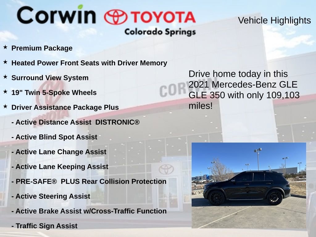 This Mercedes-Benz GLE is well equipped and includes the following features and benefits, Premium Package, Heated Power Front Seats with Driver Memory, Surround View System, 19" Twin 5-Spoke Wheels, 115V Power Outlet, Active Blind Spot Assist, Active Brake Assist w/Cross-Traffic Function, Active Distance Assist DISTRONIC®, Active Emergency Stop Assist, Active Lane Change Assist, Active Lane Keeping Assist, Active Speed Limit Assist, Active Steering Assist, Active Stop & Go Assist, Burmester® Surround Sound System, Driver Assistance Package Plus, Driving Assistance Plus, Evasive Steering Assist, Parking Assist Code, PRE-SAFE® PLUS Rear Collision Protection, Premium Package, Route-Based Speed Adaptation, Traffic Sign Assist. 19/26 City/Highway MPG
